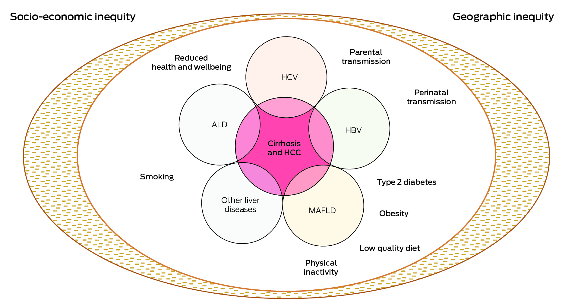 ALD = alcoholic liver disease; HBV = hepatitis B virus; HCV = hepatitis C virus; MAFLD = metabolic associated fatty liver disease. Most causes of chronic liver disease lead to HCC through the interim step of cirrhosis development. However, chronic hepatitis B infection and MAFLD may cause HCC in the absence of cirrhosis. Additionally, 30–40% of First Nations Australians have more than one risk factor for HCC.2