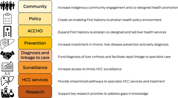 Research priorities must be set and co‐led by First Nations Australians.30 Greater understanding of biological and epidemiological drivers of HCC; optimal HCC surveillance, diagnostic and treatment modalities; and effective, culturally safe health system solutions to improve HCC outcomes for First Nations Australians are urgently needed.