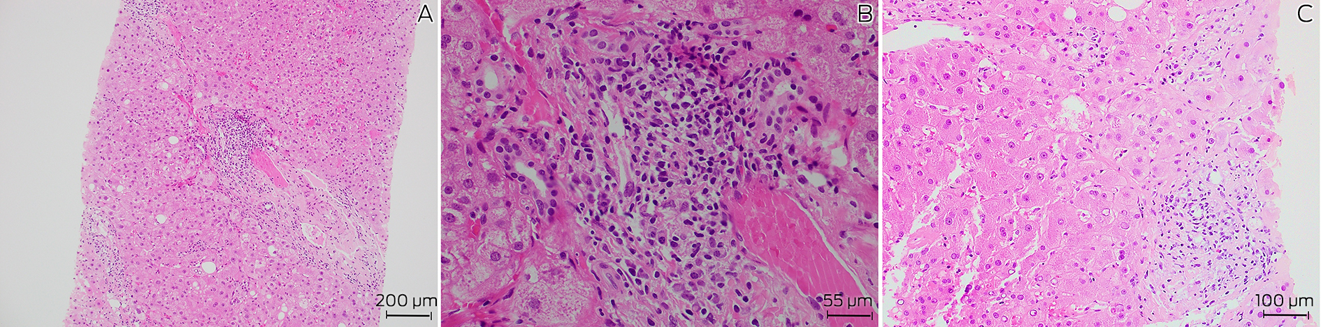 Box 1 – Histopathology of liver biopsy showing (A) chronic inflammation and fibrosis of a portal tract (hematoxylin and eosin staining, 100 × magnification), (B) prominent plasma cells in portal tracts (hematoxylin and eosin staining, 400 × magnification), and (C) epitheliod granuloma (hematoxylin and eosin staining, 200 × magnification)