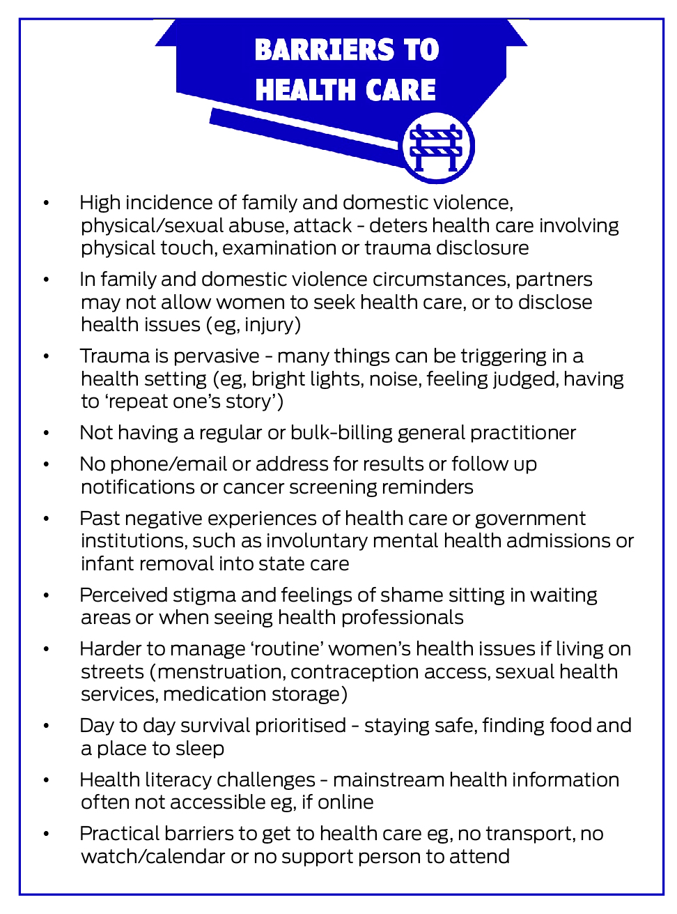 Women experiencing homelessness also face additional health challenges related to accessing appropriate and consistent sexual and reproductive health care, as well as antenatal and postnatal care,13,17 and trauma has a visceral effect on receptiveness to physical examinations and screening.18 Moreover, family and domestic violence contributes significantly to injury as a driver of female hospital use among this cohort.9