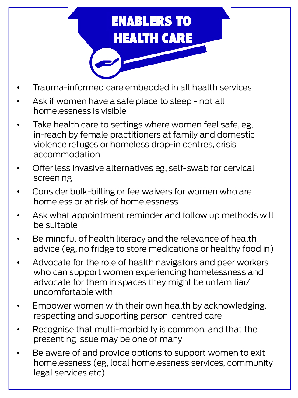 Rising rates of new and entrenched homelessness in Australia and the increasing proportion of women affected suggest that current responses are inadequate. Health and housing are fundamental human rights and without basic shelter, safety and security, it is extremely difficult to access health care or maintain good health and wellbeing. Although challenges such as affordable housing, supported accommodation and family and domestic violence prevention may be considered out of the health sector's scope of responsibility, health care providers can play an important role in advocating for and influencing change at a population level.19 Australian state, territory and federal governments have developed strategies and plans for the provision of safe and affordable housing to reduce homelessness, and health sector workers can contribute by responding to consultation opportunities and parliamentary submissions relating to homelessness and housing, and by encouraging their organisations to do the same. Patient advocacy is also needed at an individual level, and this is possible within all health care settings. Box 2 provides examples of tangible actions applicable for all health care settings. Given the role that stigma and trauma play as barriers to homeless women receiving care, recognising individuals’ needs and listening with empathy are vital starting points to improving their health.
