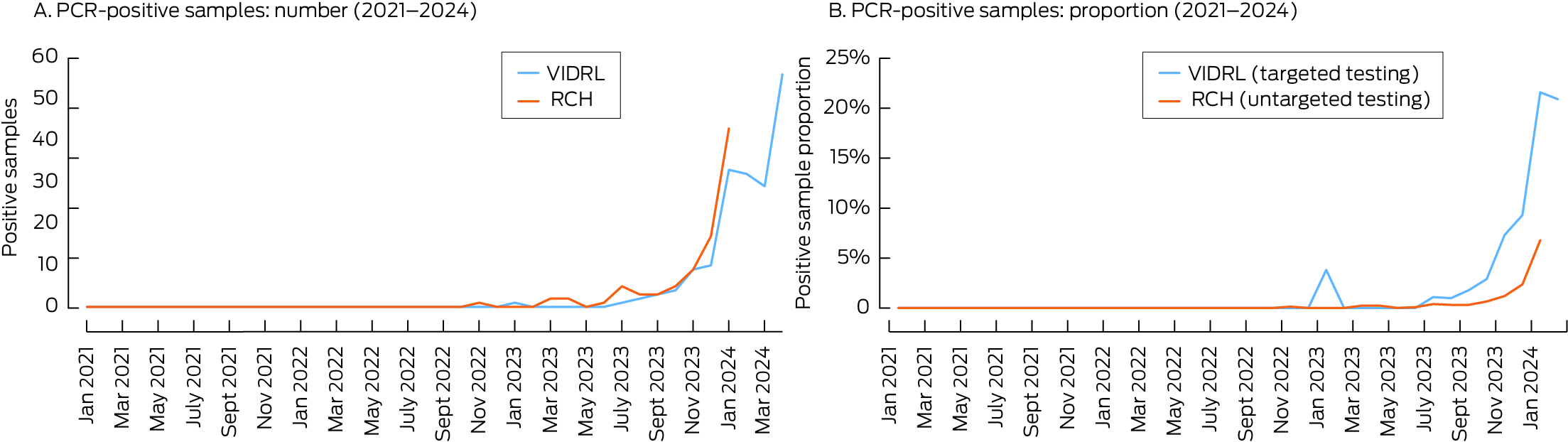 Box 1 – Results of polymerase chain reaction (PCR) testing for Mycoplasma pneumoniae in Melbourne at the Victorian Infectious Diseases Reference Laboratory (VIDRL; targeted testing) and the Royal Children's Hospital (RCH; untargeted testing), 2021–24*