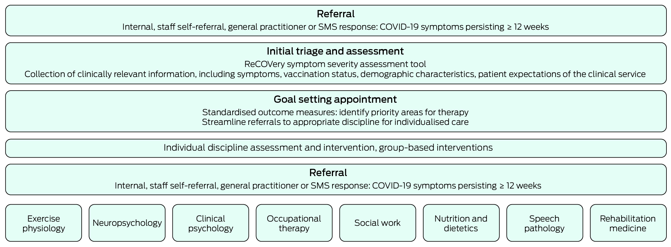 ReCOVery opened during the third peak of COVID‐19 in early 2022. Initially, all previous COVID‐19‐positive Austin Health inpatients were contacted via SMS to offer intervention (Box 1). Along with this, referrals internally from specialist clinics and self‐referrals for any Austin Health staff affected by long COVID were accepted. Our system was designed to ensure timely access to care for individuals with the most severe symptoms. This involved: