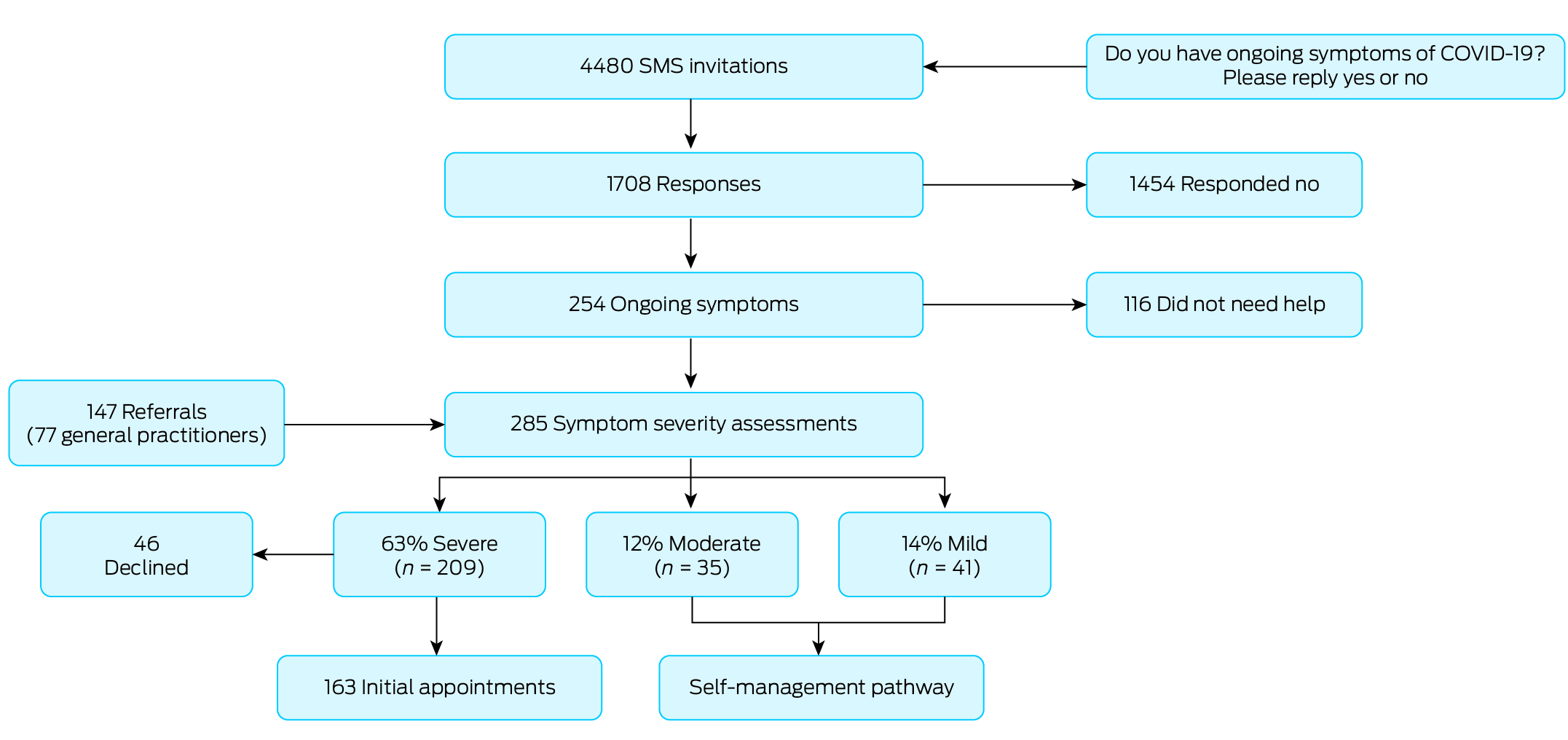 SMS messages were sent to 4480 former patients of Austin Health who had been treated for COVID‐19. About 40% of these patients (1708) responded, with 254 (15%) indicating they had ongoing symptoms. We additionally received 147 referrals (Box 2). Overall, we triaged and assessed 285 people, with 163 going on to receive individual therapy in the eight months the service operated.
