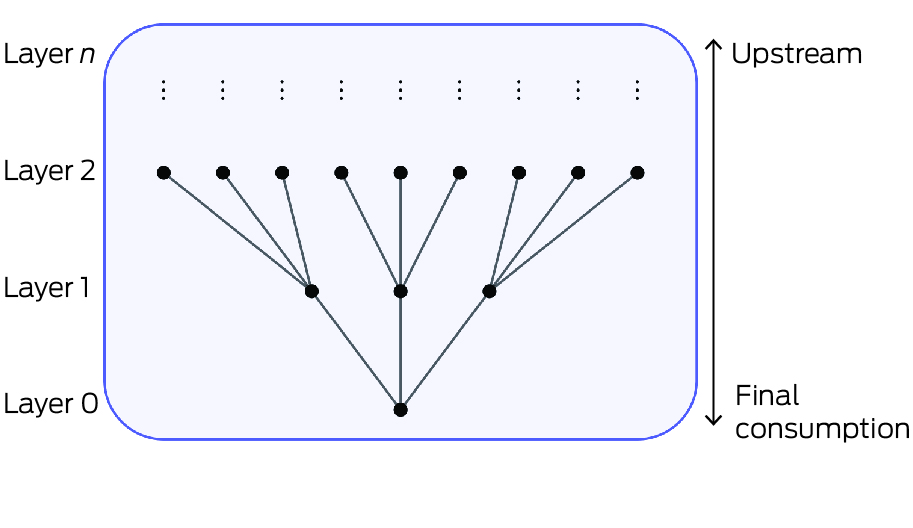 Environmental effects can occur at each layer and accumulate along the supply chain as more layers are included.6 Eventually, supply chains reach consumers as final products. Accounting for all upstream environmental impacts associated with a product or service is onerous because of the large number of production layers and the many inputs into each layer. An illustrative example of supply chain is “fossil fuel combustion > petrochemical refining > plastic sample jars > pathology services”, which is just one of the many supply chains contributing to “pathology services”.7