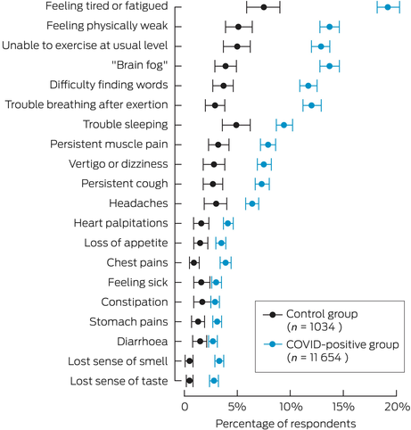 The severity of persistent symptoms after COVID‐19 in Australia will likely differ from other countries. Public health restrictions kept the infection rate low early in the pandemic and most cases occurred after vaccination was widely available.7 The mortality from COVID‐19 in Australia, one measure of severity, has been less when compared with other parts of the world (0.2% in Australia compared with 0.9% elsewhere).8 The first Australian follow‐up study, which included 2000 general hospital patients, showed that 5% of patients reported persistent symptoms at three months after infection with SARS‐CoV‐2.6 A 2022 follow‐up of a pre‐COVID‐19 cohort reported that 13.9% of those who thought they had contracted COVID‐19 described ongoing symptoms lasting more than four weeks, and almost a quarter of them said that their day‐to‐day activities were affected “a lot”.9