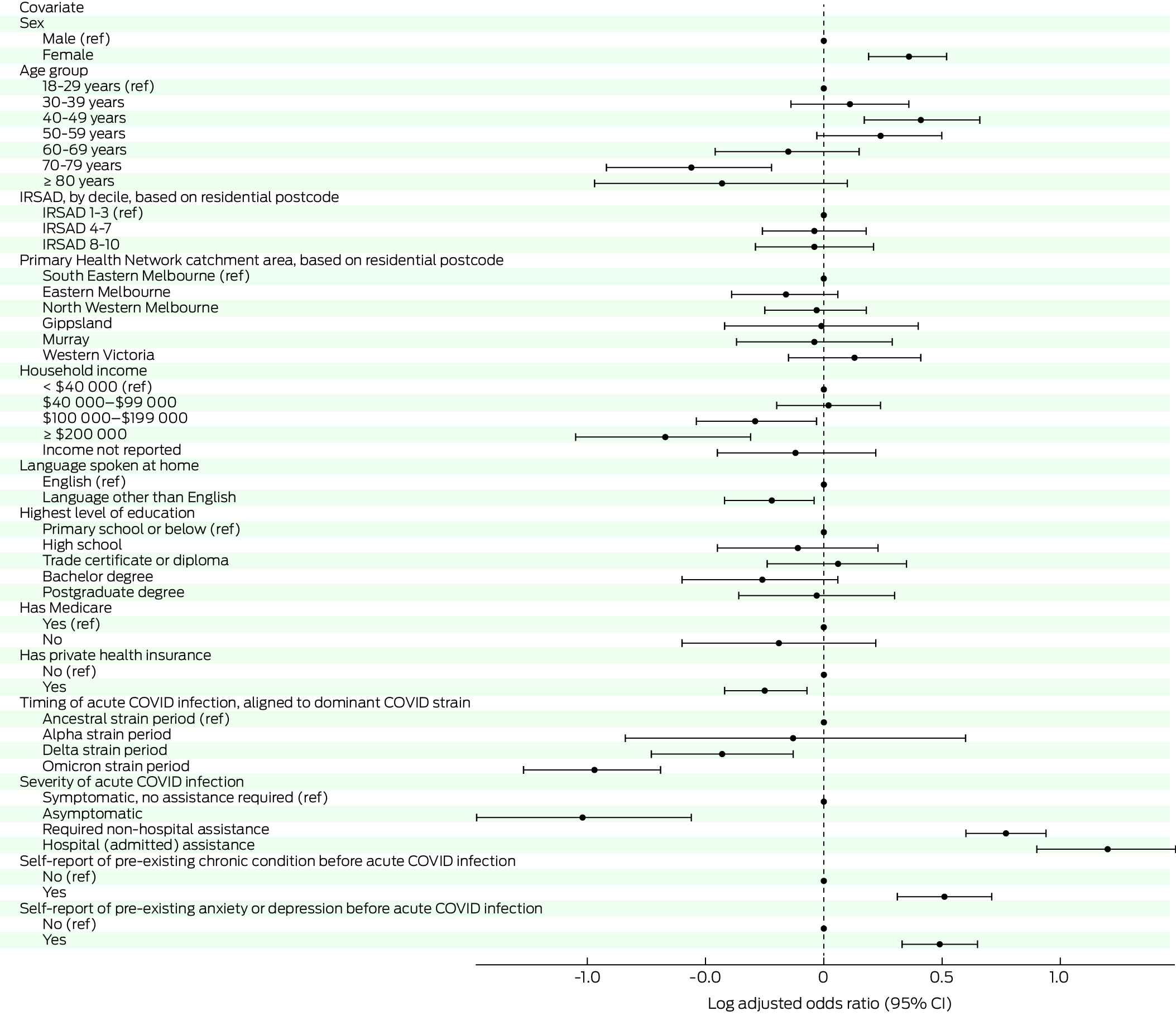 A logistic regression analysis was performed to determine the risk factors for long COVID. The covariates entered into the model were sex, age group, timing of acute COVID‐19 (aligned to dominant SARS‐CoV‐2 strain), Index of Relative Socio‐economic Advantage and Disadvantage (by decile, based on residential postcode), household income, pre‐existing chronic condition, pre‐existing anxiety or depression, language spoken at home, severity of acute COVID‐19 infection, highest level of education, Medicare access, private health insurance, and Primary Health Network catchment area (based on residential postcode).