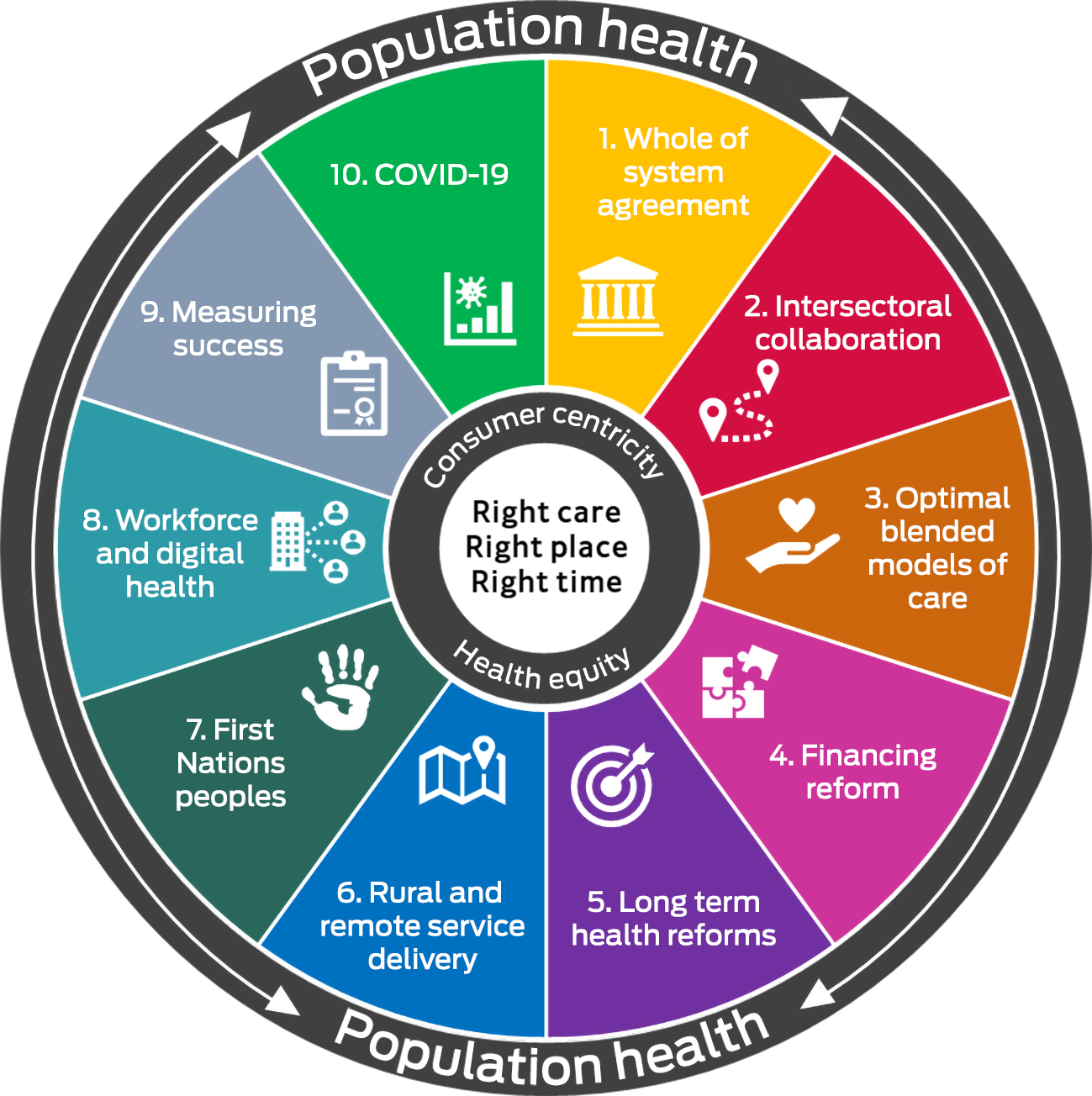 * Source: Mid‐term review of the National Health Reform Agreement Addendum 2020‐2025 final report.3 1. Whole of system agreement. Establishing the National Health Reform Agreement (NHRA) as a strategic reform agreement, with the remit and governance to take a whole of health system view. 2. Intersectoral collaboration. Delivering integrated, coordinated and responsive patient‐centred care that reduces fragmented patient care pathways, suboptimal patient experiences and outcomes, and bottlenecks in hospital flows. 3. Optimal blended models of care. Providing sustainable, innovative and scalable public hospital funding and holistic, blended models of care that can deliver the right care in the right place at the right time. 4. Financing reform. Ensuring a transparent and accountable funding model that generates the right incentives and is fit for purpose for future challenges. 5. Long term health reforms. Building innovation and options for future reform and associated governance. 6. Rural and remote service delivery. Ensuring equitable access to health care that meets rural and remote community needs and service delivery. 7. First Nations people. Strengthening and addressing culturally responsive support, access and equity of services provided to First Nations people within the health system. 8. Workforce and digital health. Enabling and incentivising a sufficient and skilled health professional workforce providing digital health services, and accessing comprehensive health information about patients across the health sector at the point of care. 9. Measuring success. Embedding a performance framework as a proactive monitoring and planning tool to measure the performance of the health system, understand future pressures, and the capacity of the system to respond to these pressures. 10. Coronavirus disease 2019 (COVID‐19). Providing flexibility in the agreement to respond to large external shocks and major disruptions to the system, such as COVID‐19.