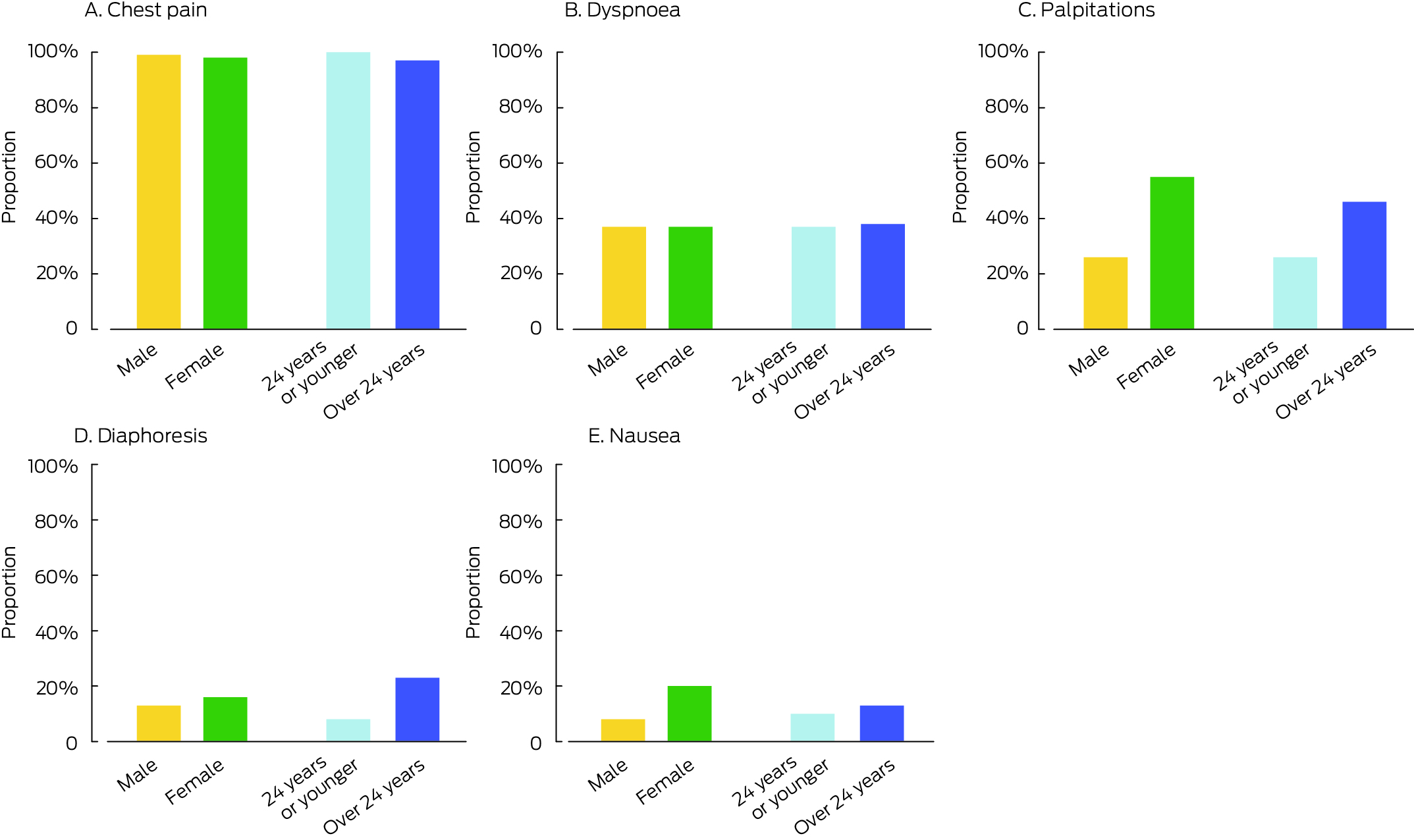 The most frequent symptom on presentation was chest pain (204 people, 99%) (Box 2). Palpitations were less frequently reported by male than female patients (40, 26% v 28, 55%; aOR, 0.77; 95% CI, 0.66–0.89) (Box 3).