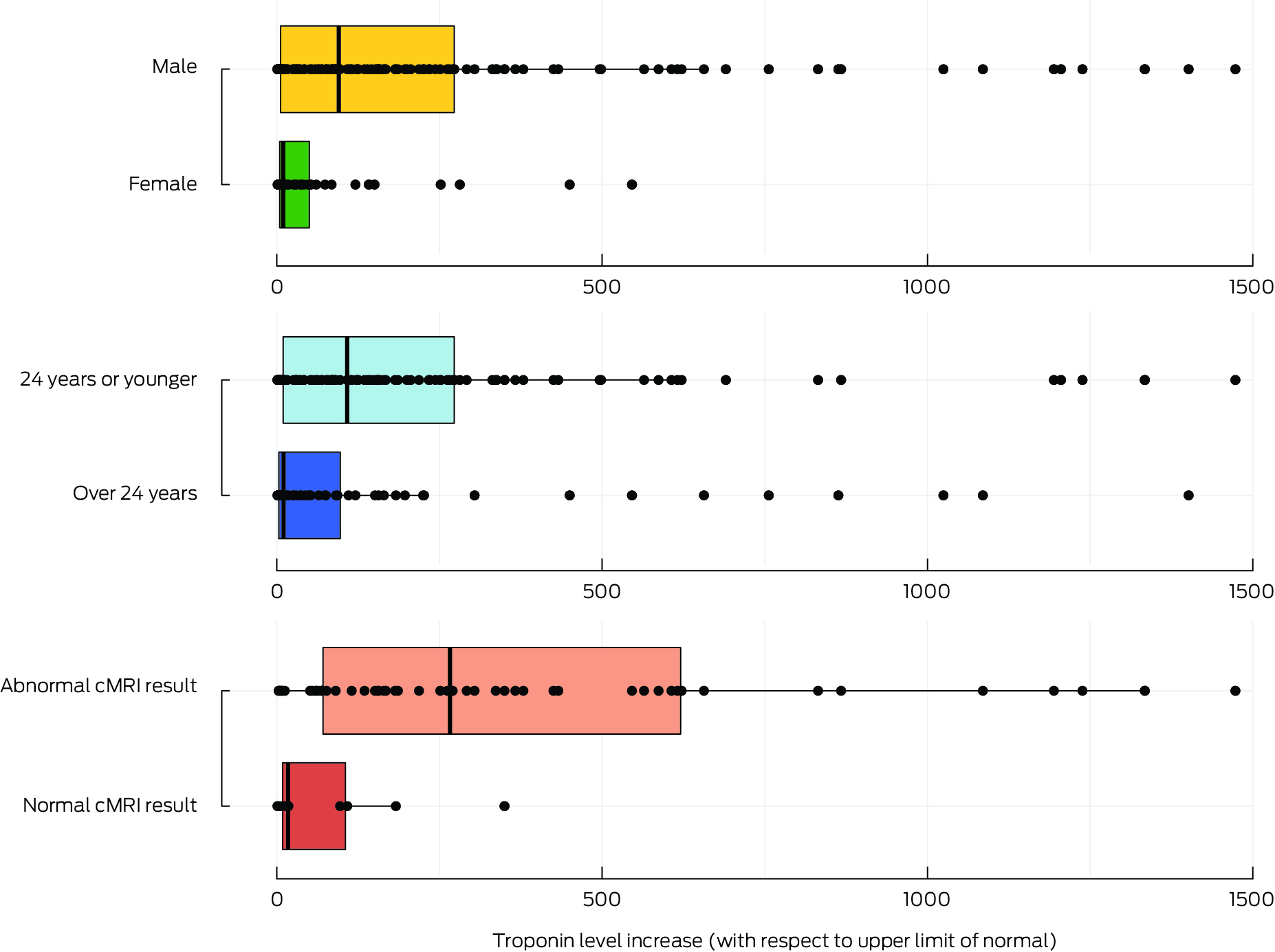 Troponin levels were elevated in 205 of 206 patients. The median increase, relative to the local upper limit of normal, was 60.8‐fold (IQR, 5–234‐fold); the median increase was greater in male (95.3‐fold; IQR, 5.8–273‐fold) than female patients (9.9‐fold; IQR, 4.7–50‐fold), and greater for those aged 24 years or younger (108‐fold; IQR, 9.9–273‐fold) than for patients over 24 years of age (10.6‐fold; IQR, 3.1–97.6‐fold) (Box 4). In multivariate analyses, the magnitude of the troponin level increase (≤ 5‐fold v > 5‐fold) was not significantly influenced by age group or sex (Box 3).