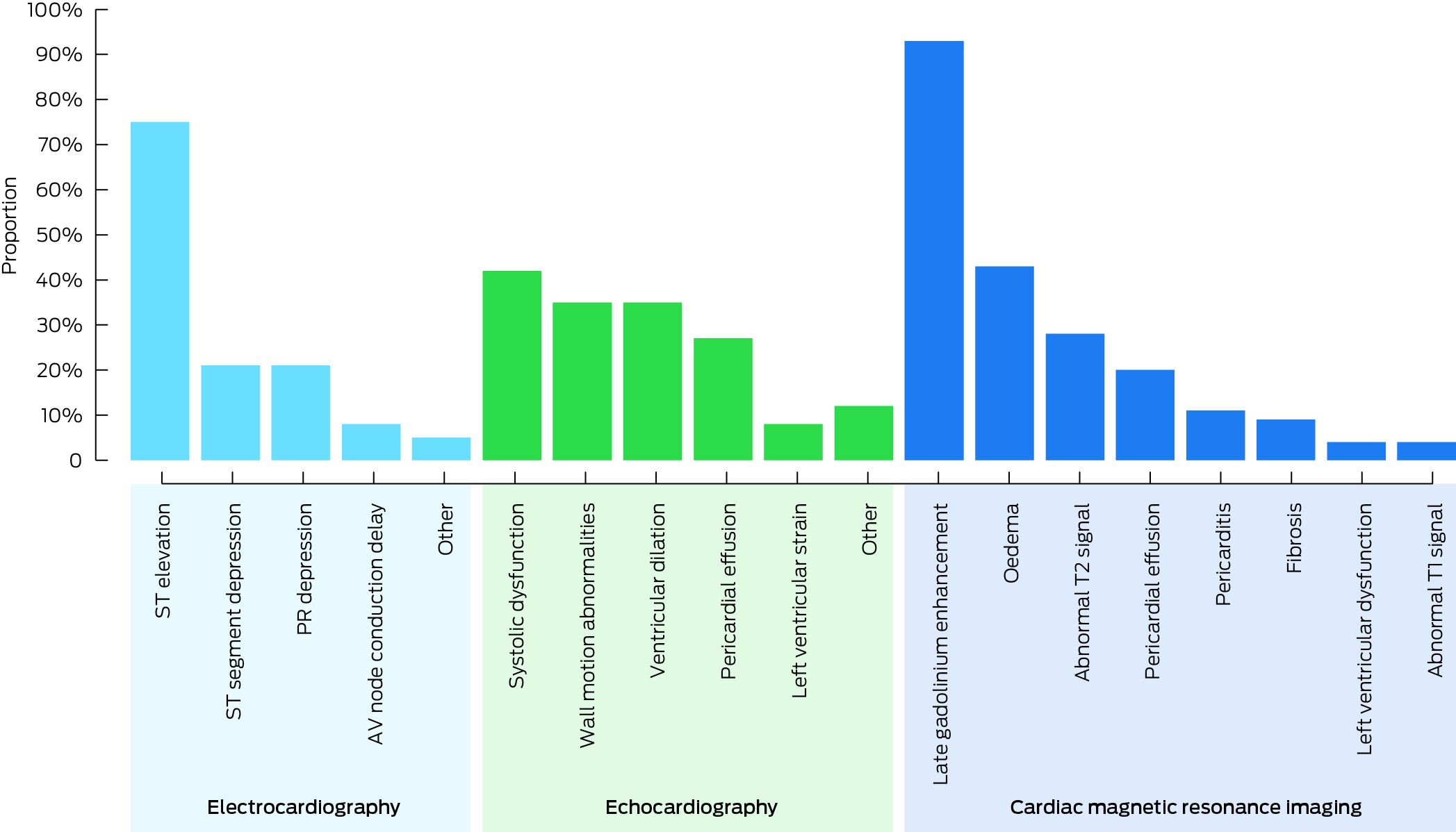 Higher rates of abnormal echocardiography and cMRI findings in male patients and of abnormal cMRI findings in those aged 24 years or younger were not statistically significant. However, only a relatively small number of people underwent cMRI; the number undertaken at the time of diagnosis was limited by funding and resource constraints. As myocarditis can evolve over time, we are undertaking further cMRI evaluations and long term imaging of sequelae in our study cohort.22 This is important because certain echocardiographic abnormalities are associated with poorer outcomes for people with myocarditis,23 and cMRI is an important tool for both diagnosing and predicting adverse outcomes.24