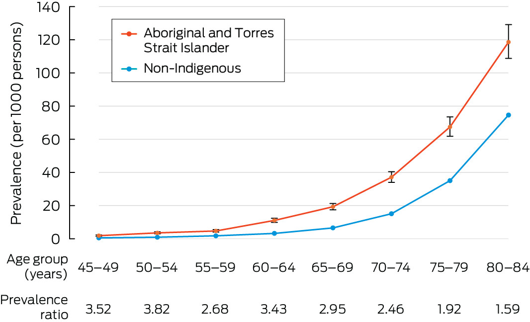 We found that the crude dementia prevalence for Aboriginal and Torres Strait Islander peoples aged 45–84 years was 1.3 times that for the non‐Indigenous population. When age‐standardised to the WHO population, the prevalence ratio increased to 2.2. These estimates are lower than those seen in most previous community cohort and linked data studies, with varying age bands, methods and standard populations employed, and modelling for dementia under‐diagnosis limiting direct comparison.11,12,13,31 Our findings are most in keeping with those of a study that used linked hospital and mortality data for all age groups in New South Wales, which showed an age‐adjusted dementia prevalence ratio of 2.02 (95% CI, 1.80–2.27).32
