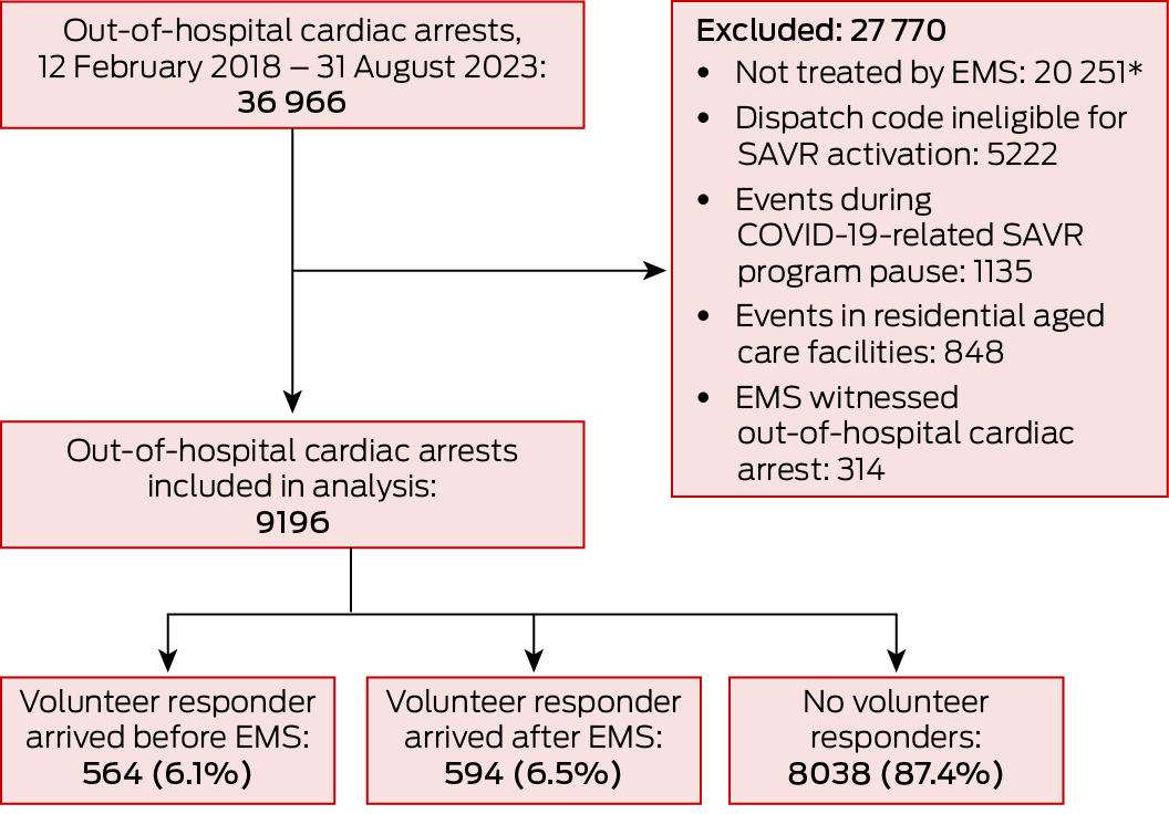 We undertook a retrospective observational study of all out‐of‐hospital cardiac arrests not witnessed by EMS personnel that were eligible for SAVR activation in Victoria during 12 February 2018 – 31 August 2023. We excluded cardiac arrests in residential aged care facilities, and cases in which resuscitation by EMS personnel was not attempted. We also excluded cases during 23 March 2020 – 16 October 2020, when the Victorian SAVR program was paused because of coronavirus disease 2019 (COVID‐19) lockdowns; it recommenced in rural regions on 16 October 2020 and elsewhere on 9 November 2020. We also excluded cases with EMS dispatch codes ineligible for SAVR activation; that is, if the person taking the emergency call identified that the cardiac arrest is secondary to trauma, hanging, overdose, or assault, or if there are site‐related safety concerns, but the precipitating event is not always identified before EMS arrival. We reported our study according to the Strengthening the Reporting of Observational Studies in Epidemiology (STROBE) statement.11