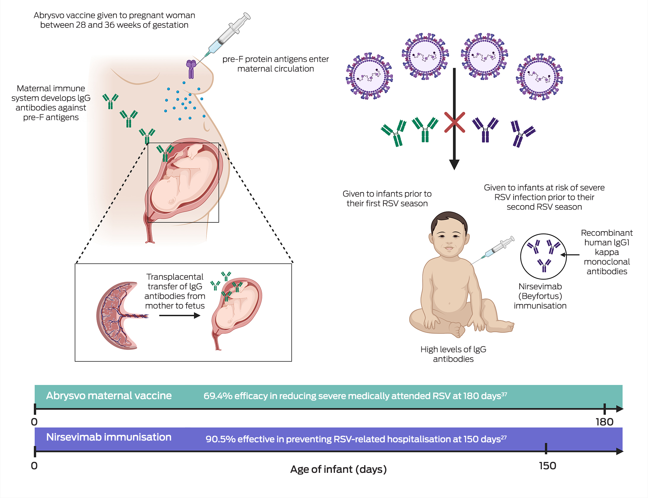 The landscape of RSV prevention in Australia rapidly evolved in 2024 with the introduction of two new prophylactic measures to protect infants: immunisation with long‐acting monoclonal antibody nirsevimab and maternal RSV vaccine Abrysvo. Maternal vaccination offers the advantage of protecting infants from birth through the passive transfer of antibodies, while nirsevimab provides direct and extended protection of infants during times of peak RSV activity.