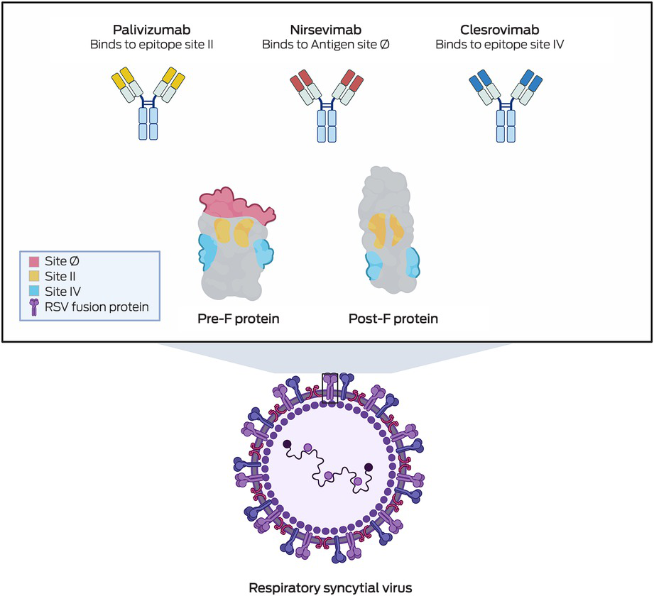 Clesrovimab (Merck), another form of RSV prophylaxis, is also a half‐life extended human monoclonal antibody targeting the pre‐F RSV glycoprotein. Phase 3 clinical trials have recently been completed,44 and show that among healthy preterm and full‐term infants (birth to 1 year of age), clesrovimab reduced the incidence of RSV‐associated medically attended lower respiratory infections by 60.4% compared with a placebo.44 Additionally, clesrovimab lowered RSV‐related hospitalisations by 84.2% and severe RSV cases by 91.7%,44 highlighting its potential in preventing severe RSV infections in infants. Box 3 shows the various epitopes on the RSV pre‐F protein that palivizumab, nirsevimab and clesrovimab each bind to — sites II, Ø and IV, respectively. This variation in binding sites could become clinically relevant in time, particularly if escape mutants develop resistance to one of the antibodies. Additionally, clesrovimab has demonstrated increased availability in extravascular compartments compared with nirsevimab,45 a characteristic that may enhance its efficacy in preventing RSV infections.