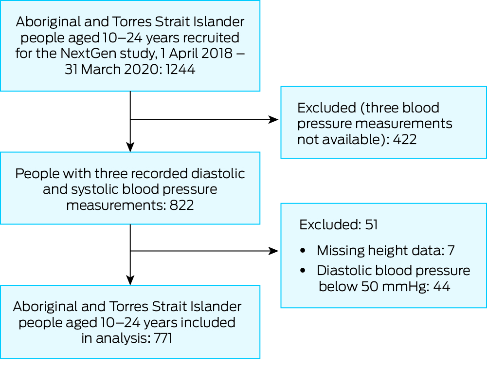 Of 1244 young people recruited for the NextGen study, three recorded diastolic and systolic blood pressure measurements were available for 822 (66%); 51 participants were excluded because height data were not recorded (needed for computing blood pressure percentiles) or their recorded diastolic blood pressure was less than 50 mmHg (Box 1). The mean age of the 771 included participants (62%) was 15.4 years (SD, 3.9 years; 435 [56.4%] under 16 years of age); 438 were girls or young women (56.8%), and 467 lived in Western Australia (60.6%). Most participants rated their overall health as excellent (142, 19.1%), very good (174, 23.4%), or good (249, 33.5%) (Box 2). About 80% reported consuming at least two servings of fruits and two servings of vegetables per day, and 184 (29.7%) reported consuming high salt snacks no more than once per week.