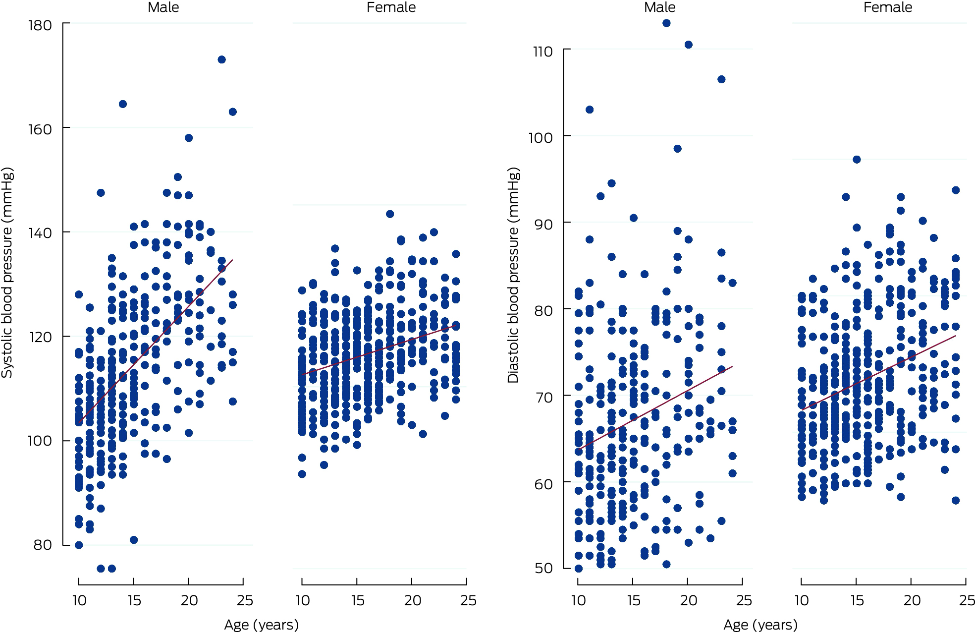 Results: Complete data were available for 771 of 1244 study participants (62%); their mean age was 15.4 years (standard deviation [SD], 3.9 years), 438 were girls or young women (56.8%). Mean systolic blood pressure was 111.2 mmHg (SD, 13.7 mmHg), mean diastolic blood pressure 66.3 mmHg (SD, 11.0 mmHg). Mean systolic blood pressure was higher for male than female participants (mean difference, 6.38 mmHg; 95% CI, 4.60–8.16 mmHg), and it increased by 1.06 mmHg (95% CI, 0.76–1.36 mmHg) per year of age. Mean systolic blood pressure increased by 0.42 mmHg (95% CI, 0.28–0.54 mmHg) and diastolic blood pressure by 0.46 mmHg (95% CI, 0.35–0.57 mmHg) per 1.0 kg/m2 increase in body mass index. Ninety‐one participants (11.8%) had blood pressure readings indicating pre‐hypertension, and 148 (19.2%) had hypertension. The risks of pre‐hypertension (RRR, 4.22; 95% CI, 2.52–7.09) and hypertension (RRR, 1.93; 95% CI, 1.27–2.91) were higher for male than female participants; they were greater for people with obesity than for those with BMI values in the normal range (pre‐hypertension: RRR, 2.39 [95% CI, 1.26–4.55]; hypertension: RRR, 3.20 [95% CI, 1.91–5.35]) and for participants aged 16–19 years (pre‐hypertension: 3.44 [95% CI, 1.88–6.32]; hypertension: RRR, 2.15 [95% CI, 1.29–3.59]) or 20–24 years (pre‐hypertension: 4.12 [95% CI, 1.92–8.85]; hypertension: RRR, 4.09 [95% CI, 2.24–7.47]) than for those aged 10–15 years.