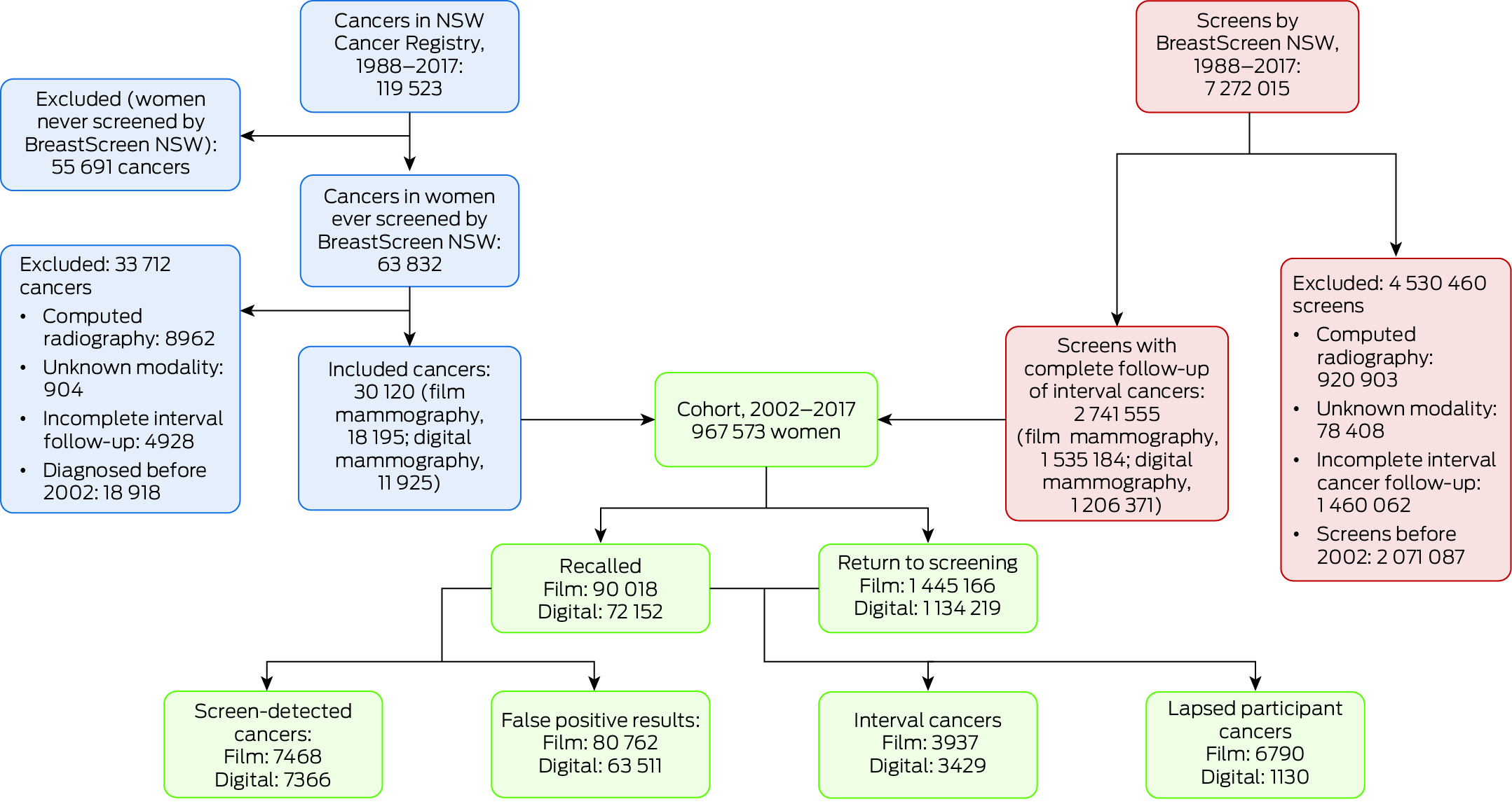 During 2002–2017, BreastScreen NSW undertook a total of 5 200 928 screens; we excluded 920 903 computed radiography screens, 78 408 screens for which the modality was unknown, and 1 460 062 otherwise eligible screens for which interval cancer follow‐up was incomplete. Our study cohort comprised 967 573 women aged 40 years or older with breast cancers diagnosed during 2002–2017 who had been screened by BreastScreen NSW and for whom complete follow‐up information until the end of the recommended re‐screening interval was available (Box 1). Of the 2 741 555 screens included in our analysis, 1 535 184 used film mammography (2002–2010) and 1 206 371 used digital mammography (2006–2016) (Box 2). A total of 30 120 breast cancers were diagnosed in these women: 14 834 screen‐detected cancers and 7366 interval cancers, as well as 7920 lapsed screen participant cancers (Supporting Information, table 1).