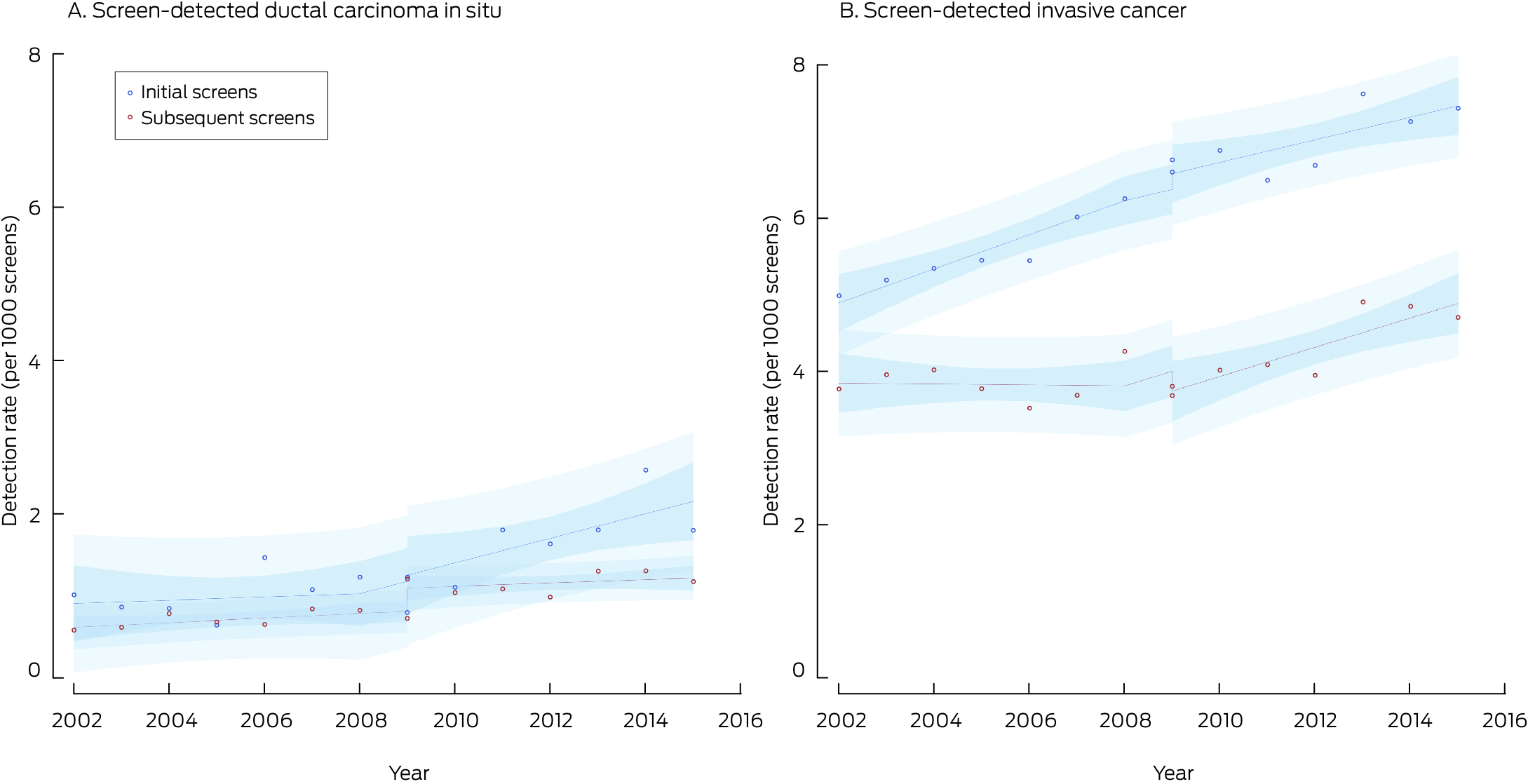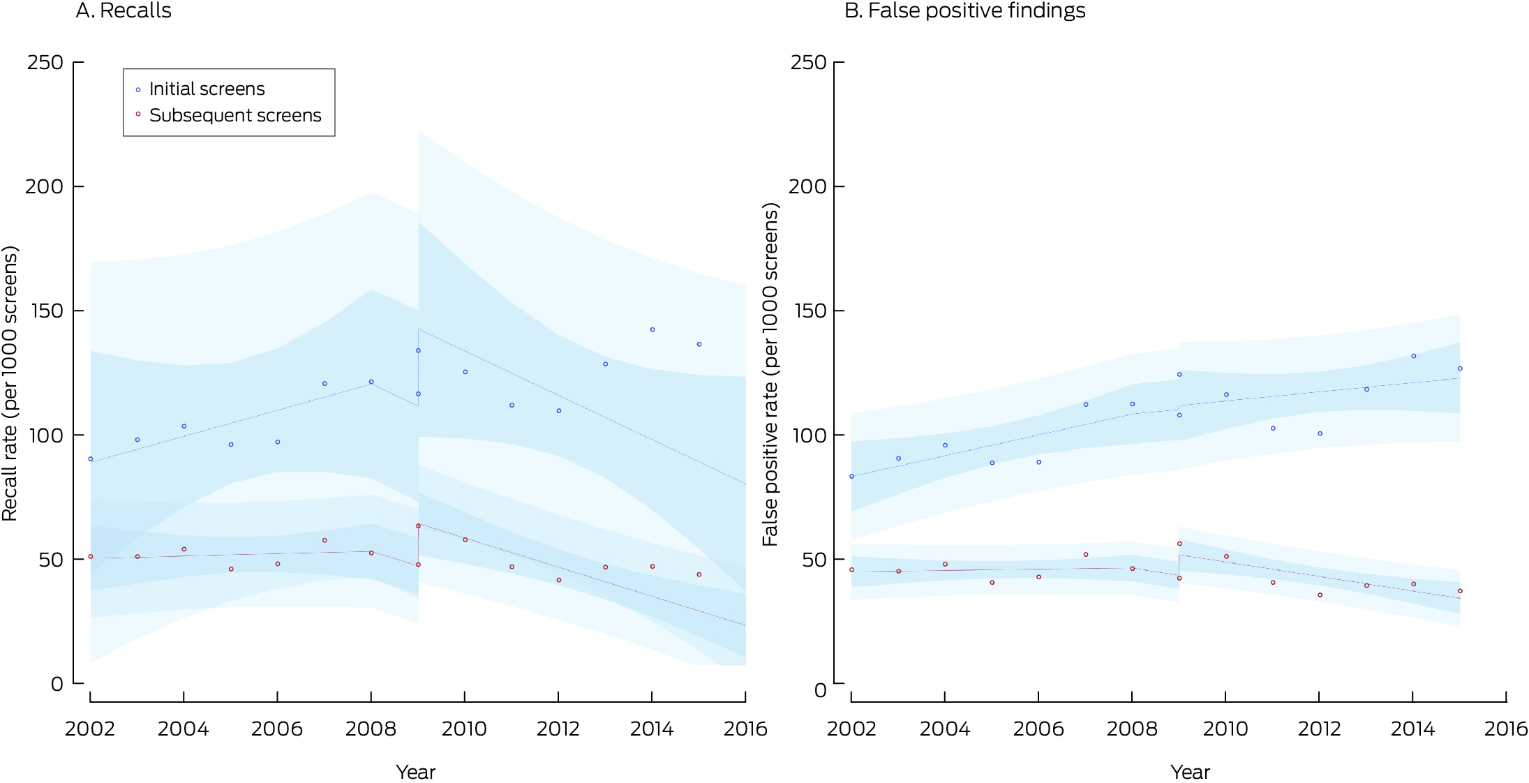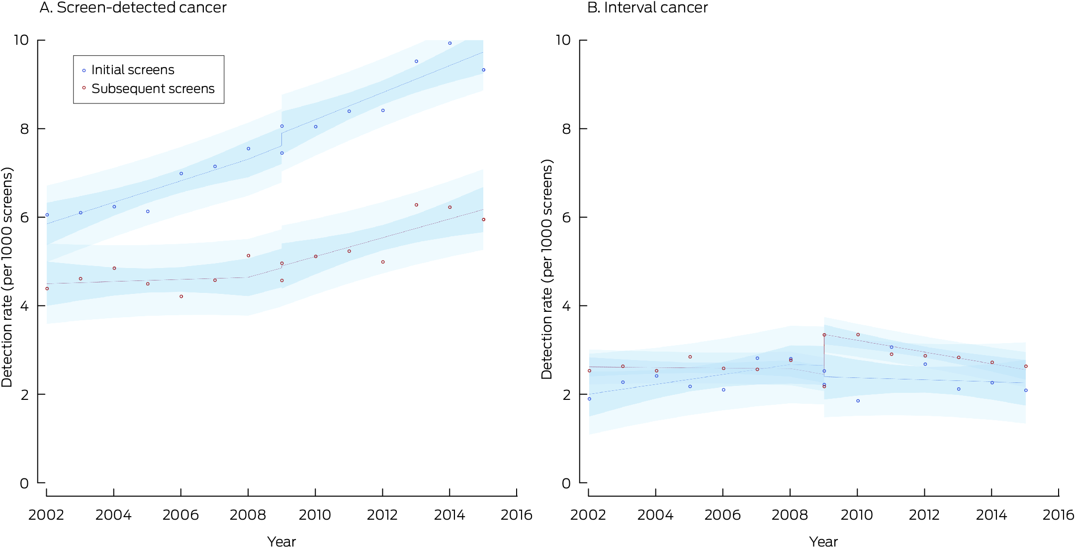 * Points indicate actual values, with fitted curves as dashed lines; dark blue region indicates 95% confidence interval for predicted trend, light blue regions 95% confidence interval for predicted values. Data for 2016 were not included, as the numbers of screens during 2016 with sufficient follow‐up time for interval cancer detection were small.