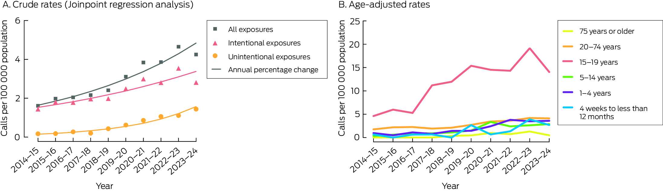 In Australia, the medicinal use of cannabidiol (CBD) was legalised in June 2015, and that of cannabis and tetrahydrocannabinol (THC) in November 2016.7 We therefore evaluated recent cannabis poisoning exposures in Australia, stratified by ingestion intent, age group, and product type. We analysed data from the New South Wales Poisons Information Centre (NSWPIC), which receives about 50% of all calls to Australian poisons information centres; 65% of calls are from within NSW, 35% from other states.8 We extracted data on demographic and exposure characteristics, patient disposition, and cannabinoid product types for calls during 1 July 2014 – 30 June 2024. We calculated crude and age‐adjusted population exposure call rates (Supporting Information, supplementary methods), and used Joinpoint regression (version 4.9.0.1) to estimate annual percentage changes (APCs) in age‐adjusted rates and to detect trend change points. The study was approved by the Sydney Children's Hospitals Network Human Research Ethics Committee (2021/ETH00165).