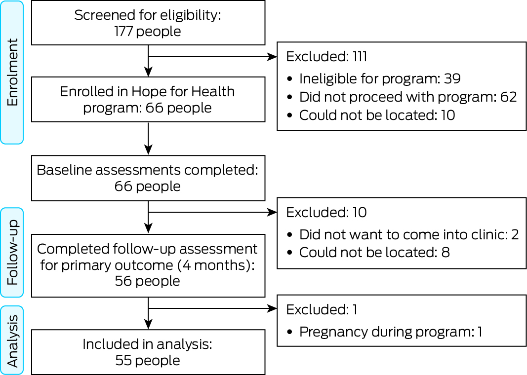 Of 177 people who registered interest in participation and provided consent to medical record review for eligibility screening, 138 (78%) were eligible and were invited to participate; 72 people did not subsequently proceed with the program or could not be located. A total of 66 people (37% of screened persons) provided consent to study participation and completed baseline assessments; data for the 55 participants who also completed the final study assessment were included in our analysis (Box 3). Mean follow-up time was 158 days (SD, 22 days).