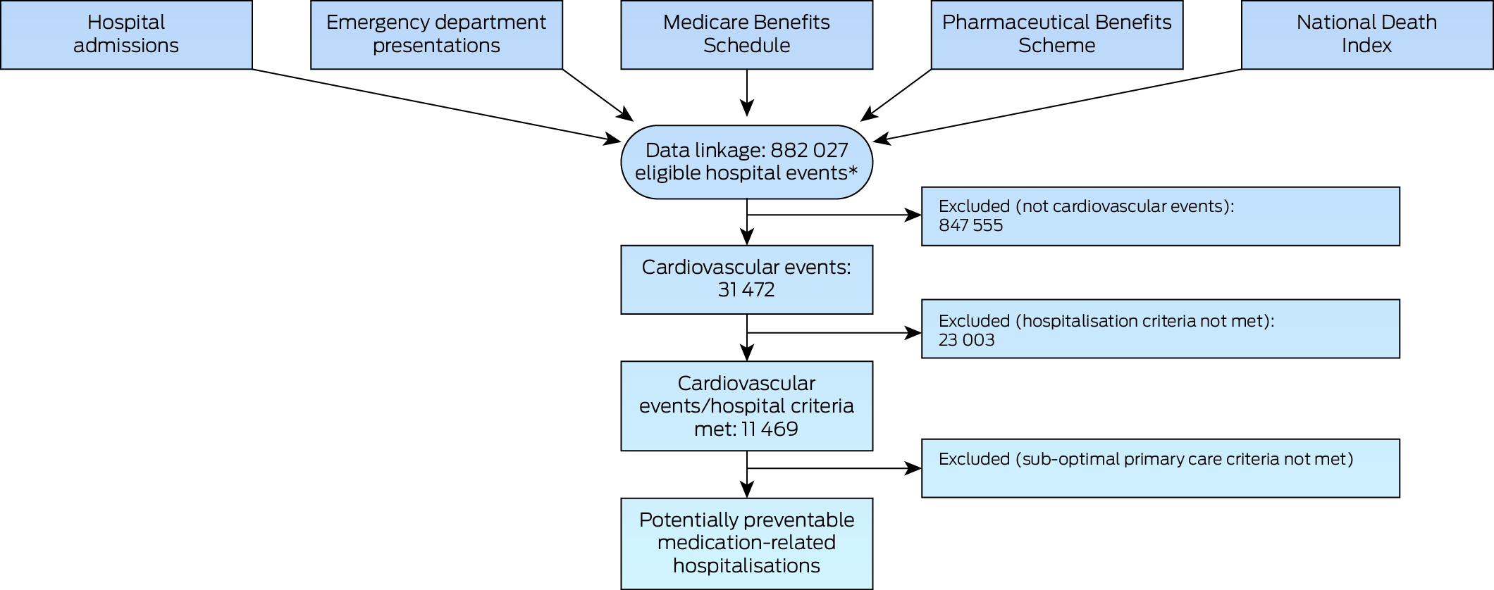 Study design: Retrospective cohort study; analysis of linked hospitalisations and emergency department presentations data and administrative records of medical services, pharmaceuticals, and deaths.