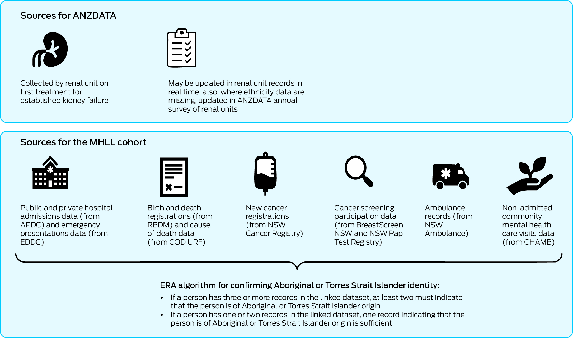 The linked NSW data assets used for ERA were the APDC, the EDDC, NSW Ambulance data, the Community Mental Health Ambulatory Data Collection, birth and death records from the NSW Registry of Births, Deaths and Marriages, the Australian Bureau of Statistics Cause of Death Unit Record File, the NSW Cancer Registry, BreastScreen NSW and the NSW Pap Test Register (Box 1). A detailed description is available elsewhere.15 The cohort includes all NSW residents with a record in at least one of these collections, and is not limited to people who have had contact with mental health services. All people receiving treatment for kidney failure are represented in the APDC.