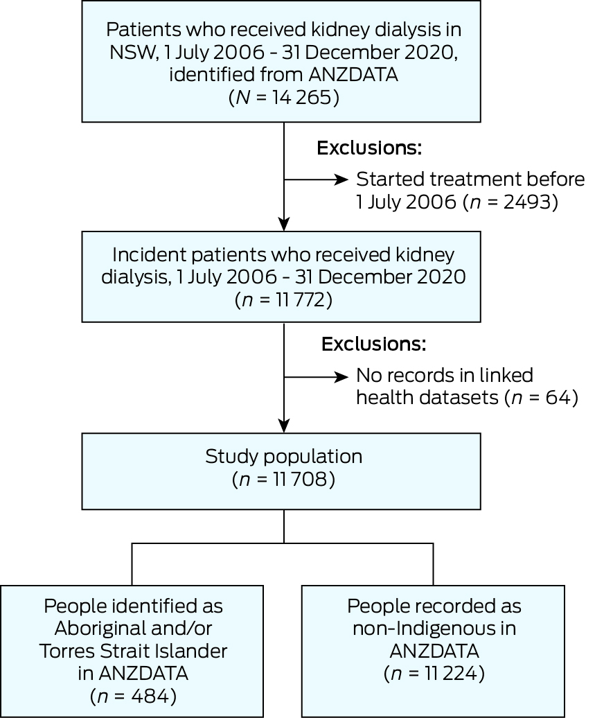 We included all incident patients who received treatment for kidney failure in NSW between 1 July 2006 and 31 December 2020, based on their inclusion in ANZDATA.