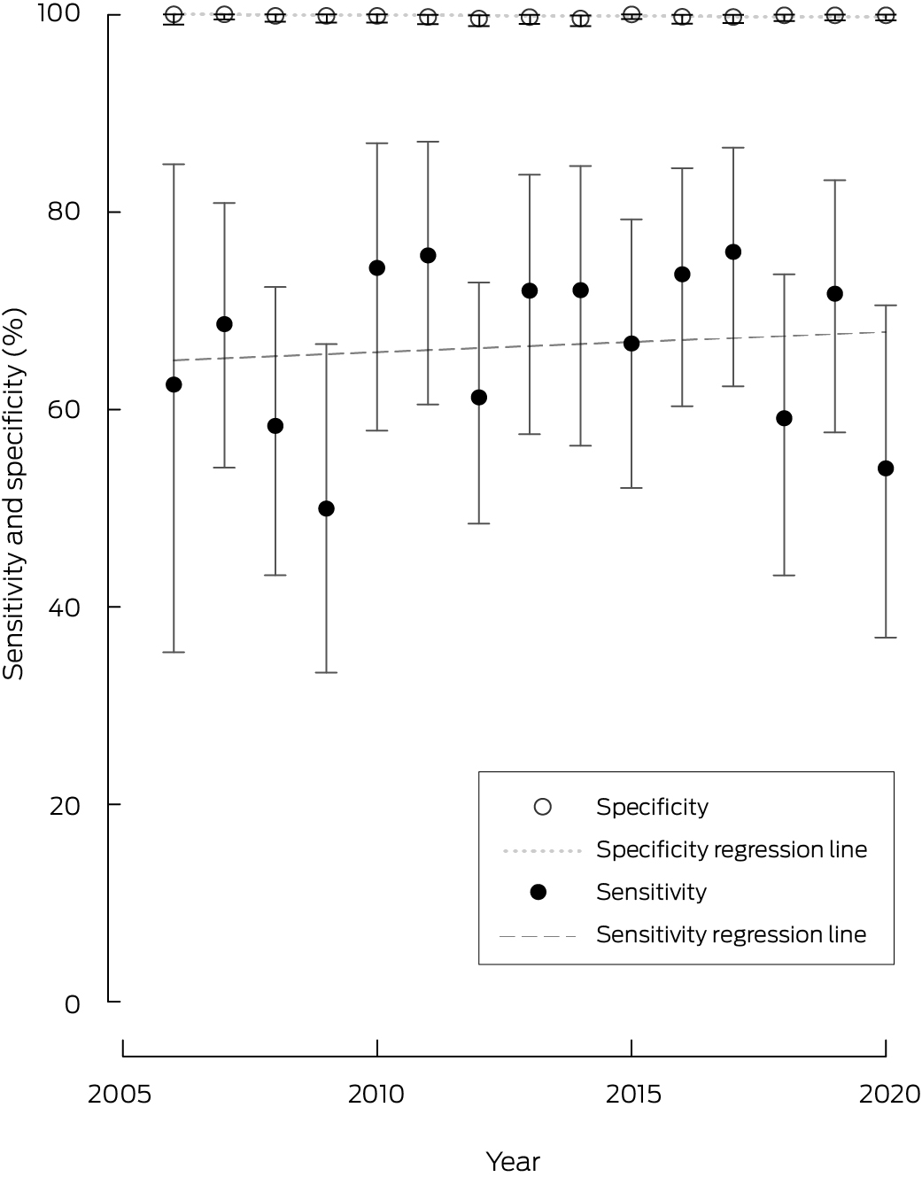 Overall ANZDATA sensitivity was 67.0% (95% CI, 63.3–70.5%; P < 0.001). In terms of sex and age, the lowest sensitivity was among people aged under 18 years (45.0%; 95% CI, 23.1–68.5%) and highest sensitivity was among female patients (70.8%; 95% CI, 65.4–75.8%) (Box 4). Higher sensitivity was associated with lower socio‐economic status, living outside of a major city, inpatient mental health care, and multimorbidity. Specificity was high across all groups, at 99.8% (95% CI, 99.7–99.9%) overall. Similarly, PPVs were high, at 95.9% (95% CI, 93.7–97.5%) overall; PPV was lowest among the least socio‐economically disadvantaged (88.2%; 95% CI, 78.1–94.8%) and 100% among people aged under 18 years (95% CI, 66.4–100%), those with moderate mental illness (95% CI, 83.2–100%), and those accessing inpatient mental health care (95% CI, 94.6–100%). NPV was lowest among people aged under 18 years (93.3%; 95% CI, 88.2–96.6%) and highest among people with moderate mental illness (99.3%; 95% CI, 98.3– 99.8%). There was no significant change in sensitivity over time (linear regression: β = 0.21, standard error = 0.51, P = 0.694; Cochran‐Armitage: P = 0.537 [Box 5]). When self‐identification data from ANZDATA was augmented with ERA from the APDC and compared with ERA from the MHLL linkage program, overall sensitivity increased to 94.8% (95% CI, 92.9–96.3% [Supporting Information, Supplementary Table 3]).
