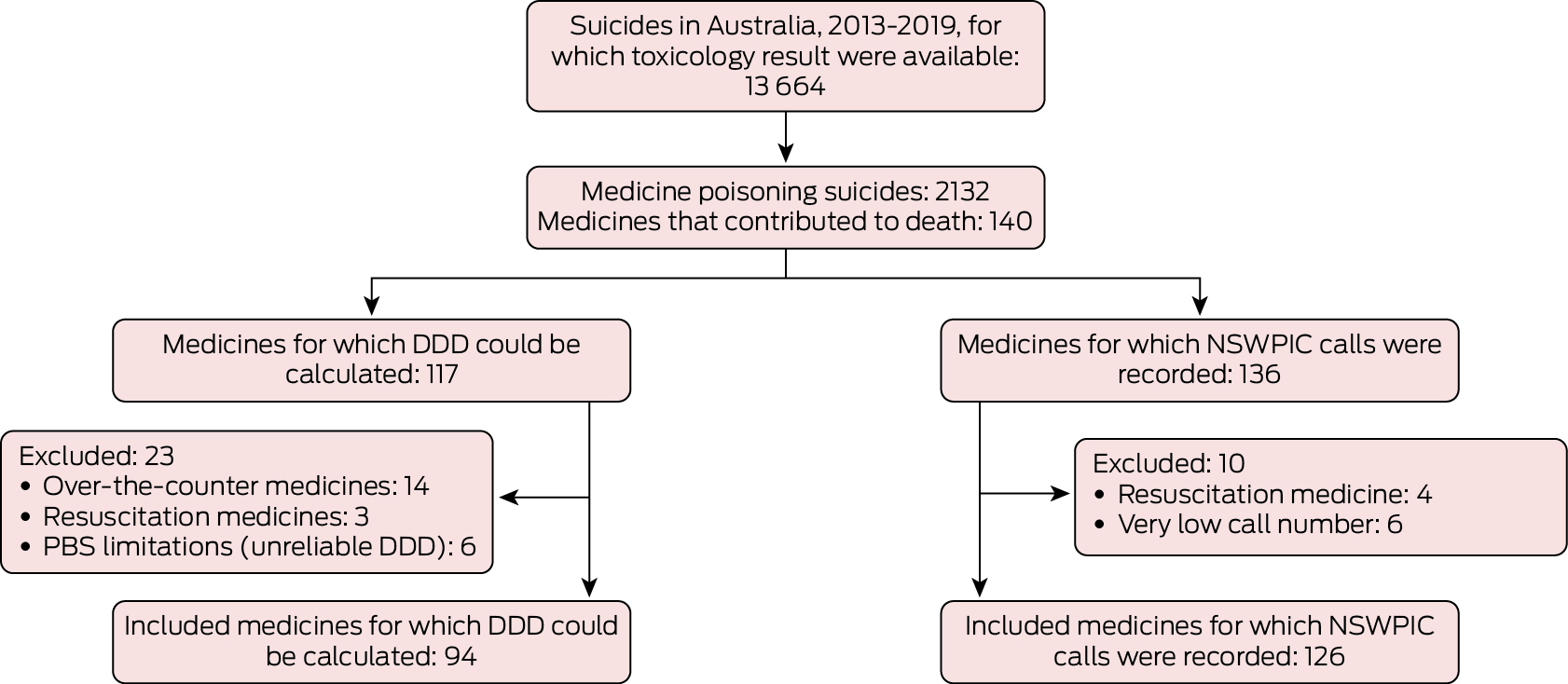 Setting, participants: Closed coronial cases for deaths of people aged ten years or older deemed to have been medicine poisoning suicides (including multiple cause deaths), Australia, 1 July 2013 – 10 October 2019, with recorded post mortem toxicology findings.