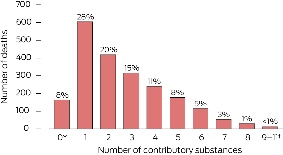 As more than one substance can contribute to a death, we calculated weighted frequencies for each contributory substance; for example, if five substances contributed to a death, each was assigned a weighted value of 0.2. The weighted values were summed to calculate the total weighted frequency for a medicine; 95% confidence intervals (CIs) were estimated using the Poisson distribution.18