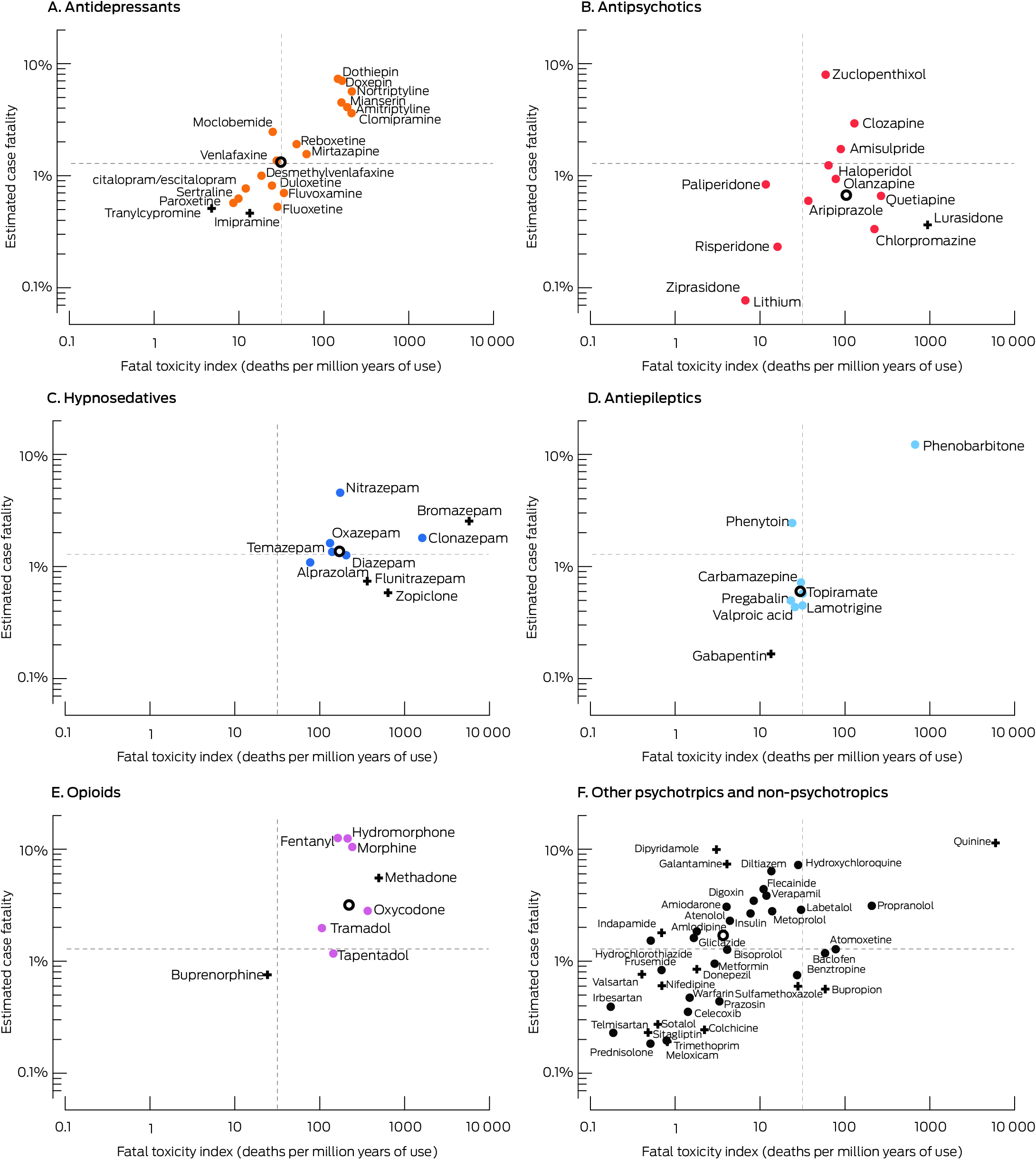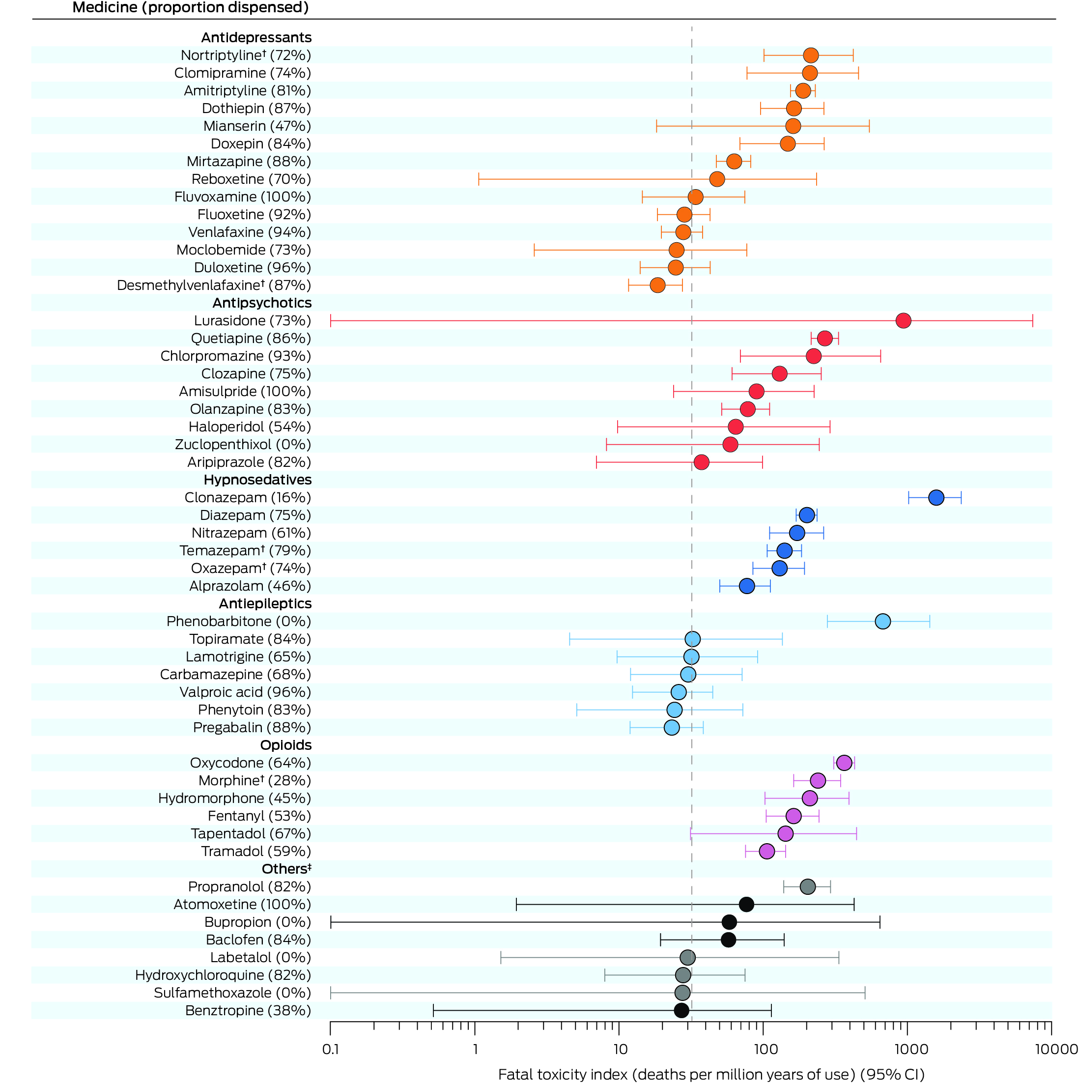 Results: During 2013–19, 2132 deaths were classified as medicine poisoning suicide deaths (median age, 51 years [interquartile range, 39–64 years]; 1036 girls or women [49%]). The 5703 detected substances deemed to have contributed to death included 140 medicines. The overall FTI was 32.0 (95% confidence interval [CI], 30.6–33.3) deaths per million years of use; overall estimated case fatality was 1.28% (95% CI, 1.23–1.34%) of poisoning events. FTI and estimated case fatality (each log10 transformed) were moderately correlated (R2 = 0.66). Both values were relatively high for most opioids, sedative psychotropics, and tricyclic antidepressants. Specific medicines with high values were phenobarbitone, oxycodone, morphine, clonazepam, nortriptyline, and propranolol; they were relatively low for risperidone and lithium. The proportions of opioids and hypnosedatives that had been recently dispensed to the deceased persons were smaller than for antidepressant, antipsychotic, and antiepileptic medicines.