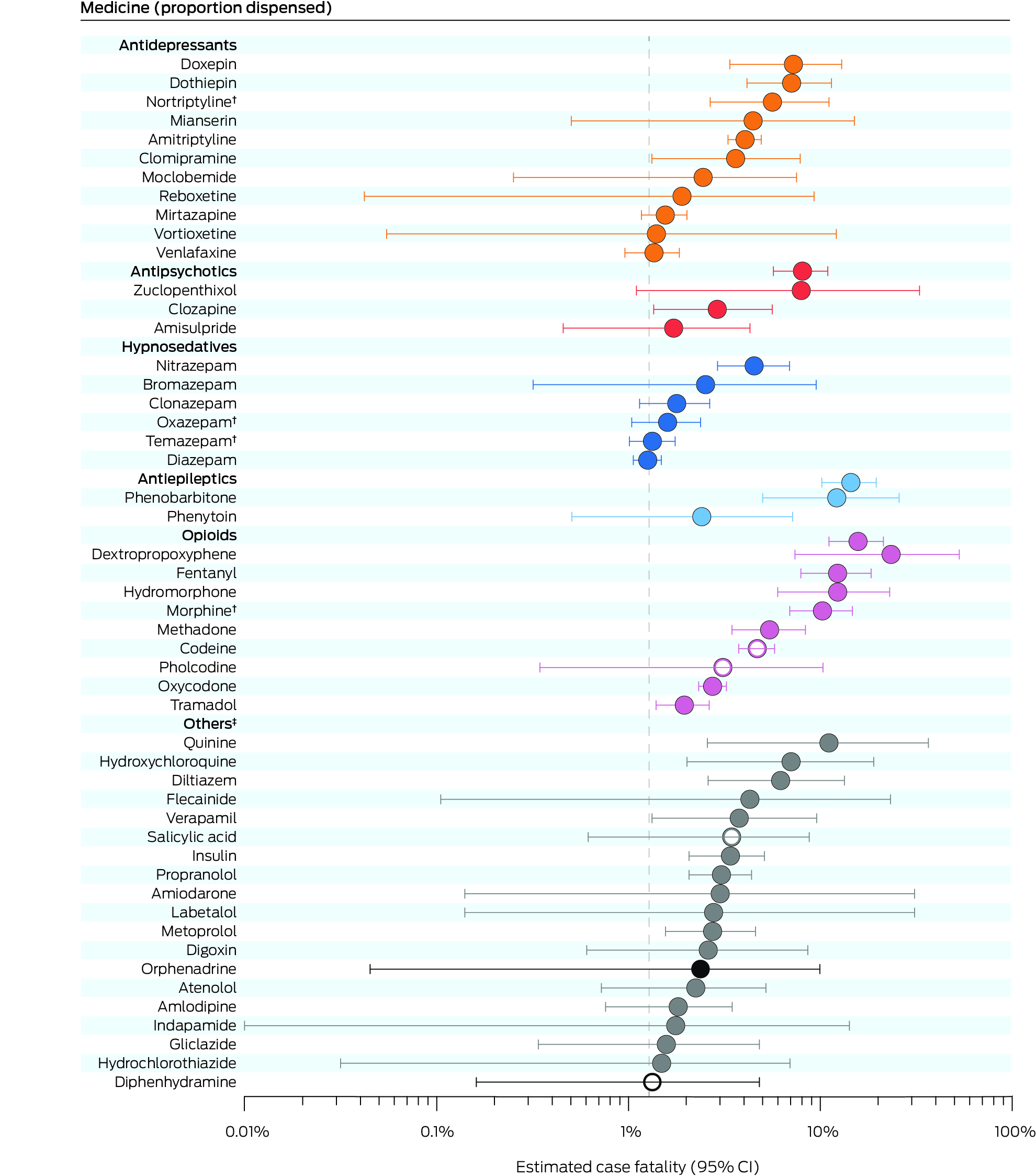 After excluding resuscitation medicines and medicines with very few poisons information centre calls (Supporting Information, table 6), we estimated case fatality for 126 medicines. The medicines with the largest values were opioids (dextropropoxyphene: 23.3% [95% CI, 7.4–53.0%]; fentanyl: 12.3% [95% CI, 7.9–18.4%]; hydromorphone: 12.3% [95% CI, 6.0–23.0%]; morphine: 10.3% [95% CI, 6.9–14.7%]) and phenobarbitone (12.2% [95% CI, 5.0–25.8%]). Among tricyclic antidepressants, estimated case fatality was highest for doxepin (7.3%; 95% CI, 3.4–13.0%), dothiepin (7.1%; 95% CI, 4.2–11.4%), and nortriptyline (5.6%; 95% CI, 2.7–11.1%); among antipsychotics, it was highest for zuclopenthixol (8.0%; 95% CI, 1.1–32.8%) and clozapine (2.9%; 95% CI, 1.4–5.6%); among cardiovascular drugs, it was highest for diltiazem (6.2%; 95% CI, 2.6–13.4%), flecainide (4.3%; 95% CI, 0.1–23.2%), and verapamil (3.8%; 95% CI, 1.3–9.6%). The over‐the‐counter medicines with highest estimated case fatality were codeine (4.7%; 95% CI, 3.8–5.8%), salicylic acid (3.5%; 95% CI, 0.6–8.8%), pholcodine (3.1%; 95% CI, 0.4–10.3%), and diphenhydramine (1.3%; 95% CI, 0.2–4.8%) (Box 4; Supporting Information, table 7).
