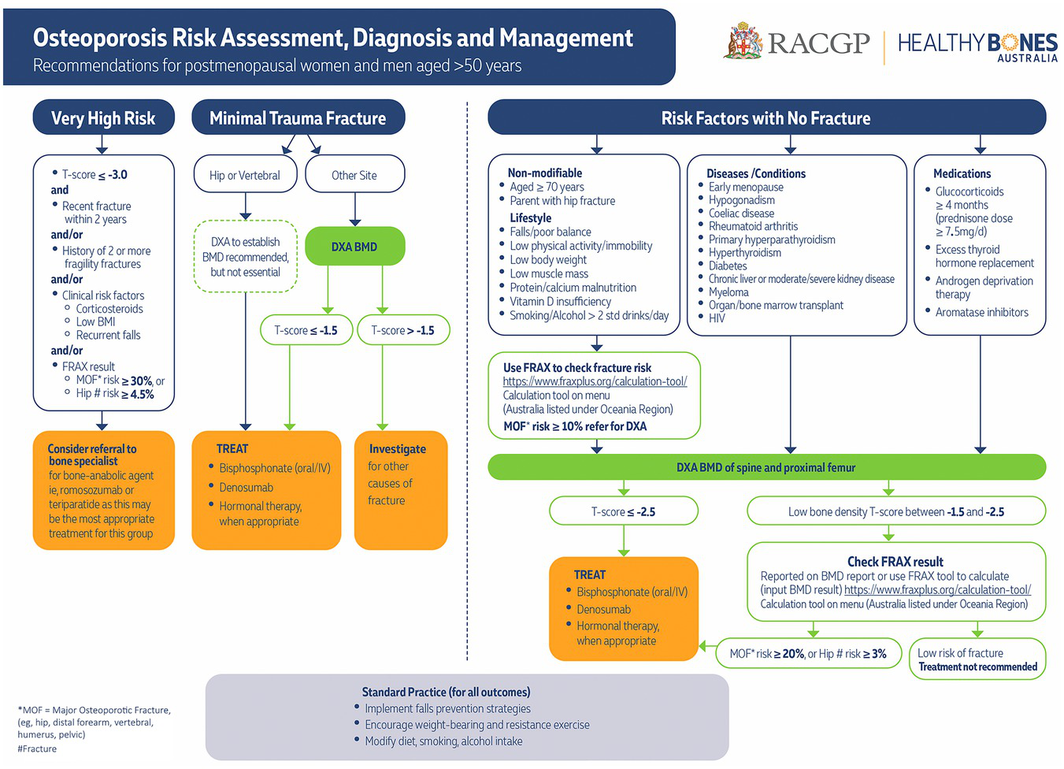 • 10. Royal Australian College of General Practitioners and Healthy Bones Australia. Osteoporosis management and fracture prevention in postmenopausal women and men over 50 years of age, 3rd ed. Melbourne: RACGP, 2024. https://www.racgp.org.au/getattachment/487c5b92‐7bd0‐4b1c‐86f5‐2d86c649f92f/Osteoporosis‐management‐and‐fracture‐prevention‐in‐post‐menopausal‐women‐and‐men‐50‐years‐of‐age.aspx (viewed Mar 2025).