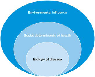 A biology–society–environment model (Box) would be an evolution in our approach and could be applied to any specialty and condition. For example, genetics, hypertension, and smoking are important biological variables in cardiovascular disease; education, geography, and socio‐economic status are also influential. Finally, the environment affects the incidence and natural history of cardiovascular disease. Air pollution, agricultural and nutritional change, soil quality, extreme weather events, including floods, heatwaves, and bushfires, all increase the incidence of cardiovascular disease.7 The environment is the final layer of the milieu that protects or harms us, associated with multiple acute and chronic diseases. As these three layers — biology, society, and environment — are incorporated routinely into medical research and clinical management, the opportunities for reducing the burden of disease are remarkable.