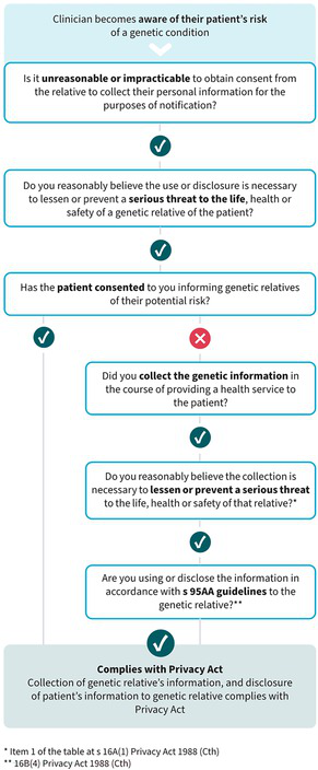 This updated guidance makes it clear that, in the case study presented (Box 1), Dr Netix could collect Molly's contact details from Cassie, and use them with Cassie's consent to notify Molly of her possible genetic risk. It also includes a flow chart to assist clinicians in applying this discretion (Box 2).18 It should be noted that the federal Privacy Act applies to private health providers, but state and territory public hospital staff are subject to local privacy laws and regulations. However, our previously published privacy analysis12 concludes that direct notification can be conducted in accordance with the regulations in each state and territory, following the same principles set out in the OAIC's updated guidance. Direct consideration of this question by state and territory regulators will assist clinicians further.