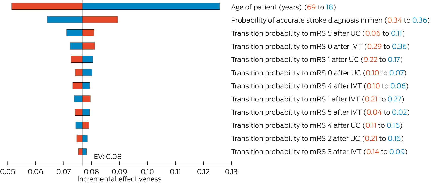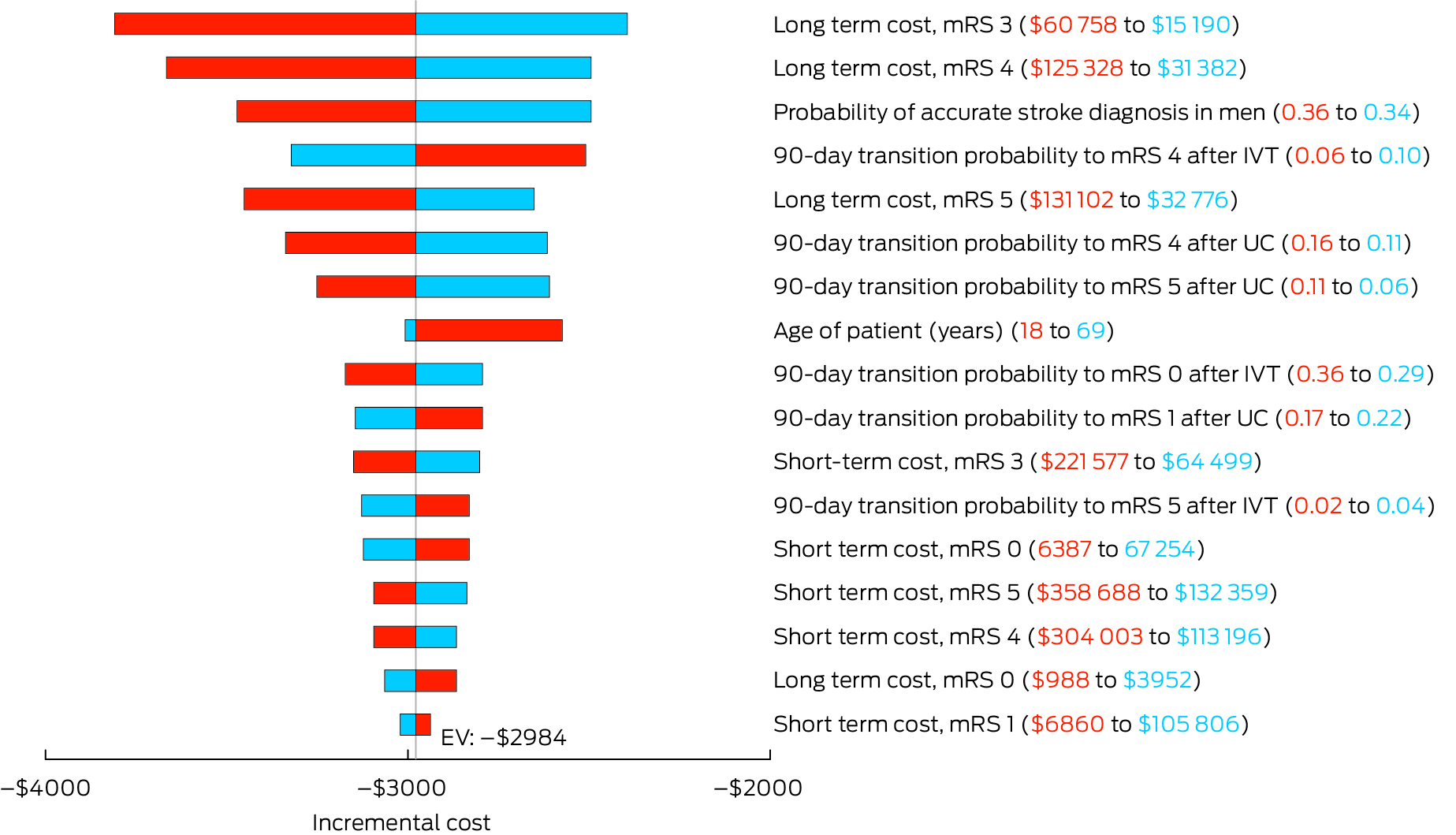 EV = expected value; IVT = intravenous thrombolysis; mRS = modified Rankin scale; UC = usual care. * Red and blue values shown in parentheses represent the lower and upper bounds of each parameter's sensitivity range. Bars indicate the influence of each parameter on incremental costs, with all others held at base case values.