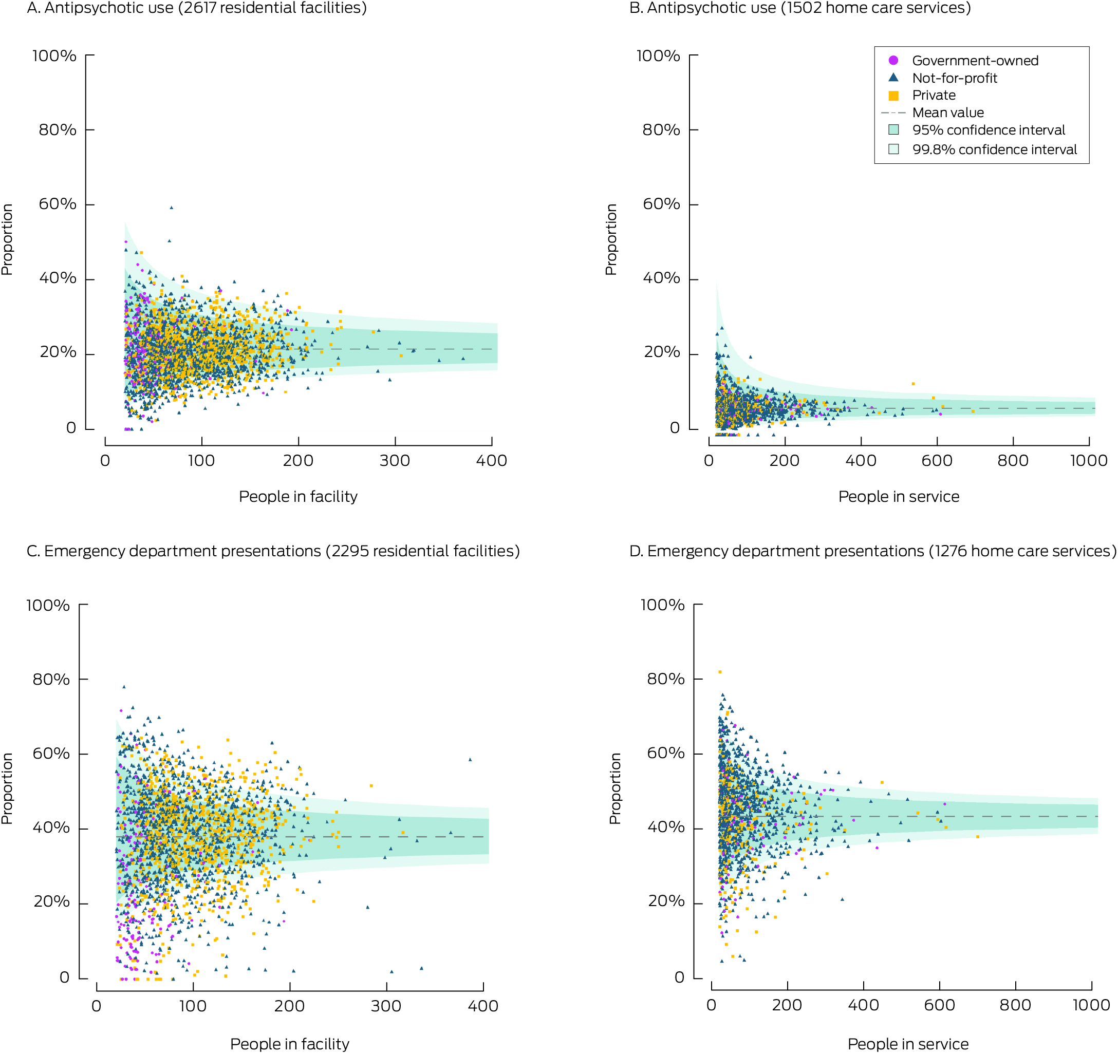 Our study evaluated the prevalence of and variations in indicators of quality of aged care in 2019, prior to the coronavirus disease 2019 (COVID‐19) pandemic and the Royal Commission into Aged Care Quality and Safety (2018–21) and subsequent national reforms. Integrating aged care and health care data is time‐intensive, typically requiring two to three years to obtain fully linked datasets from the various custodians for analysis. Although our access to more recent data has improved considerably, with full data linkage obtained in 2023, the inherent delay in data linkage remains and national improvement is required. For the hospitalisation‐related indicators, data were available from only four states, however they accounted for 87% of hospitalisations of aged care recipients during 2019.10 Data for admissions to private hospitals in South Australia were not available. However, 92% of emergency hospital admissions in Australia during 2017–18 were to public hospitals44 and private hospitals accounted for only 4% of all non‐admitted events during 2016–17.45 We probably underestimated certain indicators that rely on hospital use data for ascertainment, as only more severe cases would be recorded during the hospitalisation (eg, with weight loss/malnutrition). Clinical indications for medication‐ and service‐related indicators were not available. Further, our approach to identifying outliers has methodological limitations; for example, it probably identifies more lower outliers than when using a continuity correction. However, it is a conservative approach and unlikely to incorrectly identify providers with higher than expected rates.