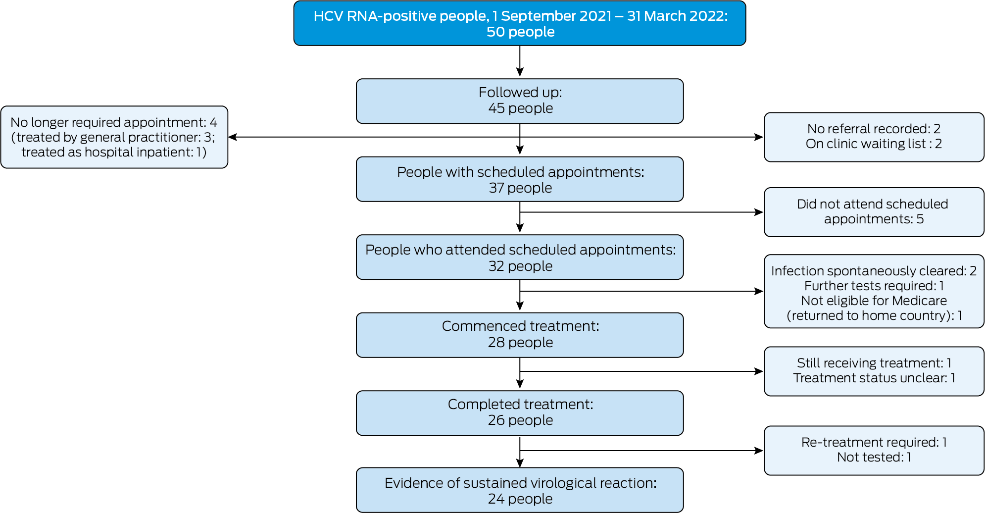 Box 1 – Cascade of tertiary care for fifty hepatitis C virus (HCV) RNA‐positive people referred to tertiary care in Victoria, 1 September 2021 – 31 March 2022