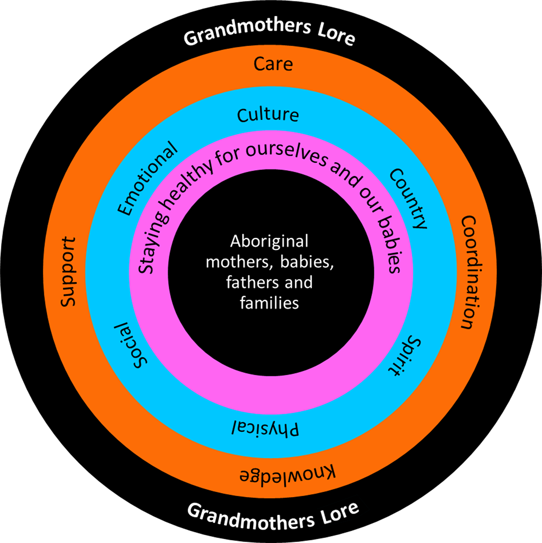 * The conceptual framework places Aboriginal mothers, babies, fathers and families at its core, symbolising their central role in the maternal health journey. Surrounding the core are essential layers that reflect the values and priorities shared by Aboriginal women, with the outer‐most layer, Grandmothers Lore, which wraps around all others, representing the wisdom, cultural guidance and ancestral strength that sustain Aboriginal families and communities.23