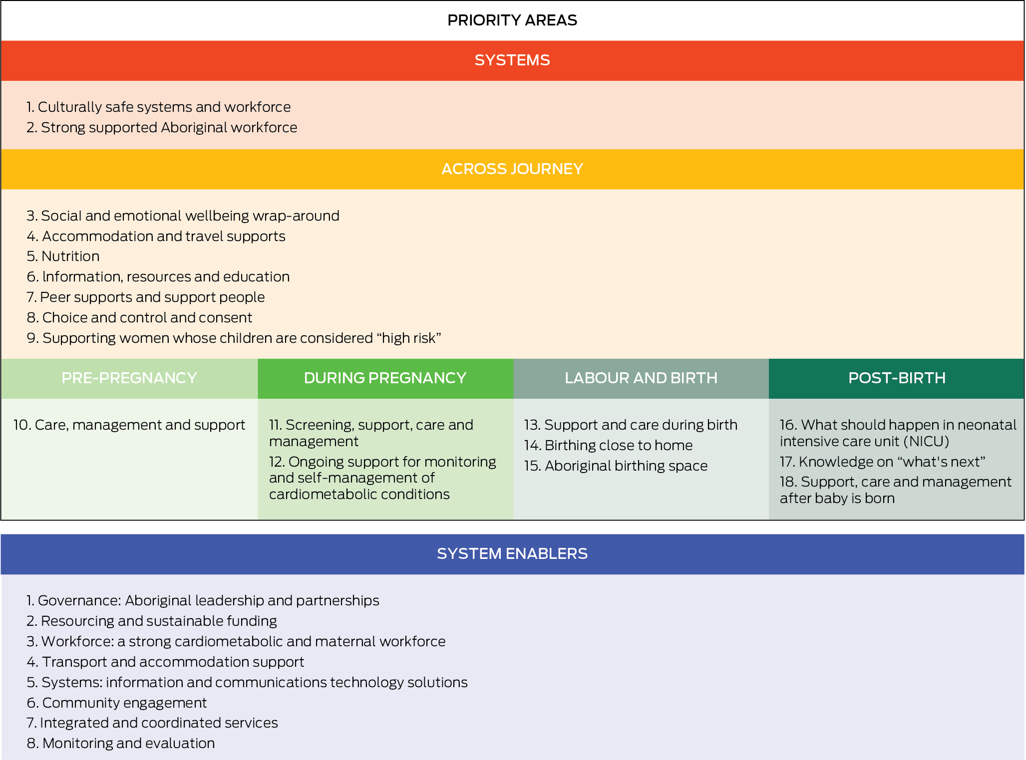The final model presents 18 priority areas, with eight system enablers necessary for implementing priorities and achieving meaningful health outcomes (Box 7). Each priority area highlights specific issues and solutions, with recommendations to guide health service providers in the first steps towards delivering culturally safe, responsive and effective maternal and child health care. The system enablers are adapted from the previous work that informed this project24 and provide the structural foundation to ensure the model is effective, resilient and culturally responsive.