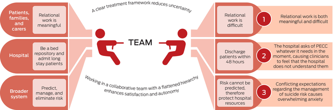 Results: The overarching finding was that working in PECCs involved conflicting, concurrent demands. Three major themes were identified: interactions with the patient: relational work is both meaningful and difficult; interactions with the health care system: conflicting expectations regarding the management of suicide risk causes overwhelming anxiety; and interactions with the hospital: the hospital asks for whatever it needs in the moment, causing clinicians to feel that it does not understand the PECC care model. Two protective factors and processes were also identified: a clear treatment framework reduces uncertainty, enhancing clinician satisfaction and continuity of care for patients; and working in a collaborative team with a flat hierarchy enhances satisfaction and autonomy.