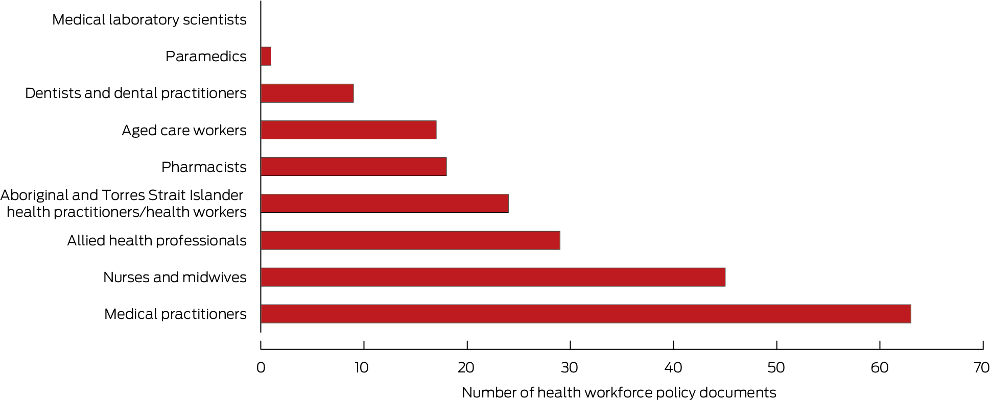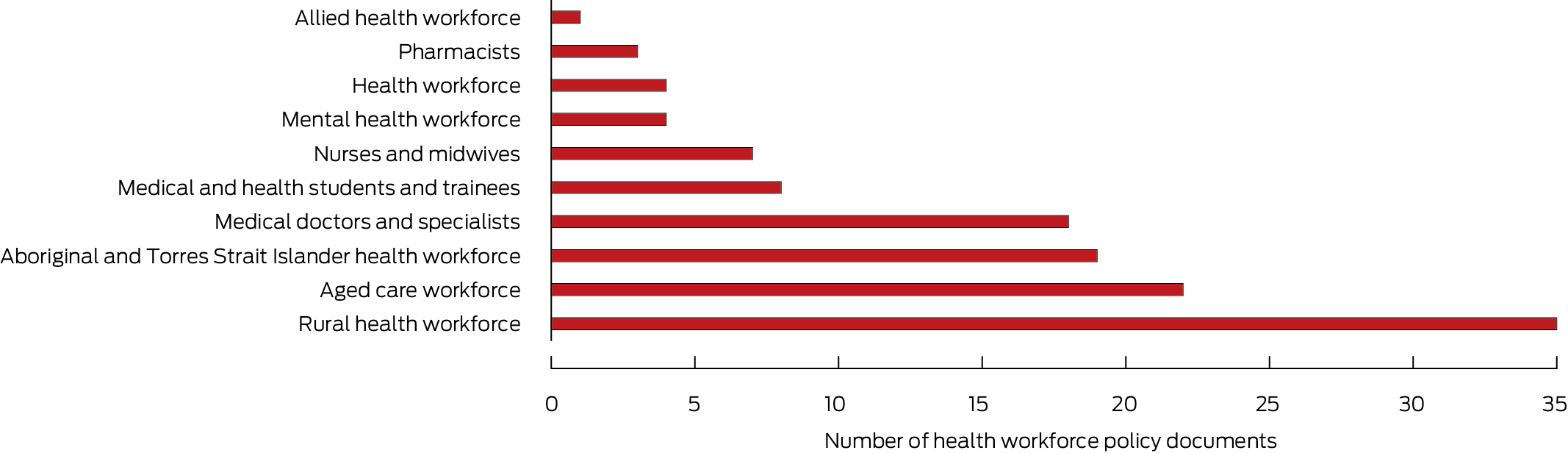 By policy group, the number of documents was greatest for the rural health workforce (35), aged care (22), and Aboriginal and Torres Strait Islander health workforce (19); the numbers were lowest for pharmacy (three) and allied health (one), and none had public health or emergency care as their focus (Box 2; Supporting Information, tables 4 to 13).