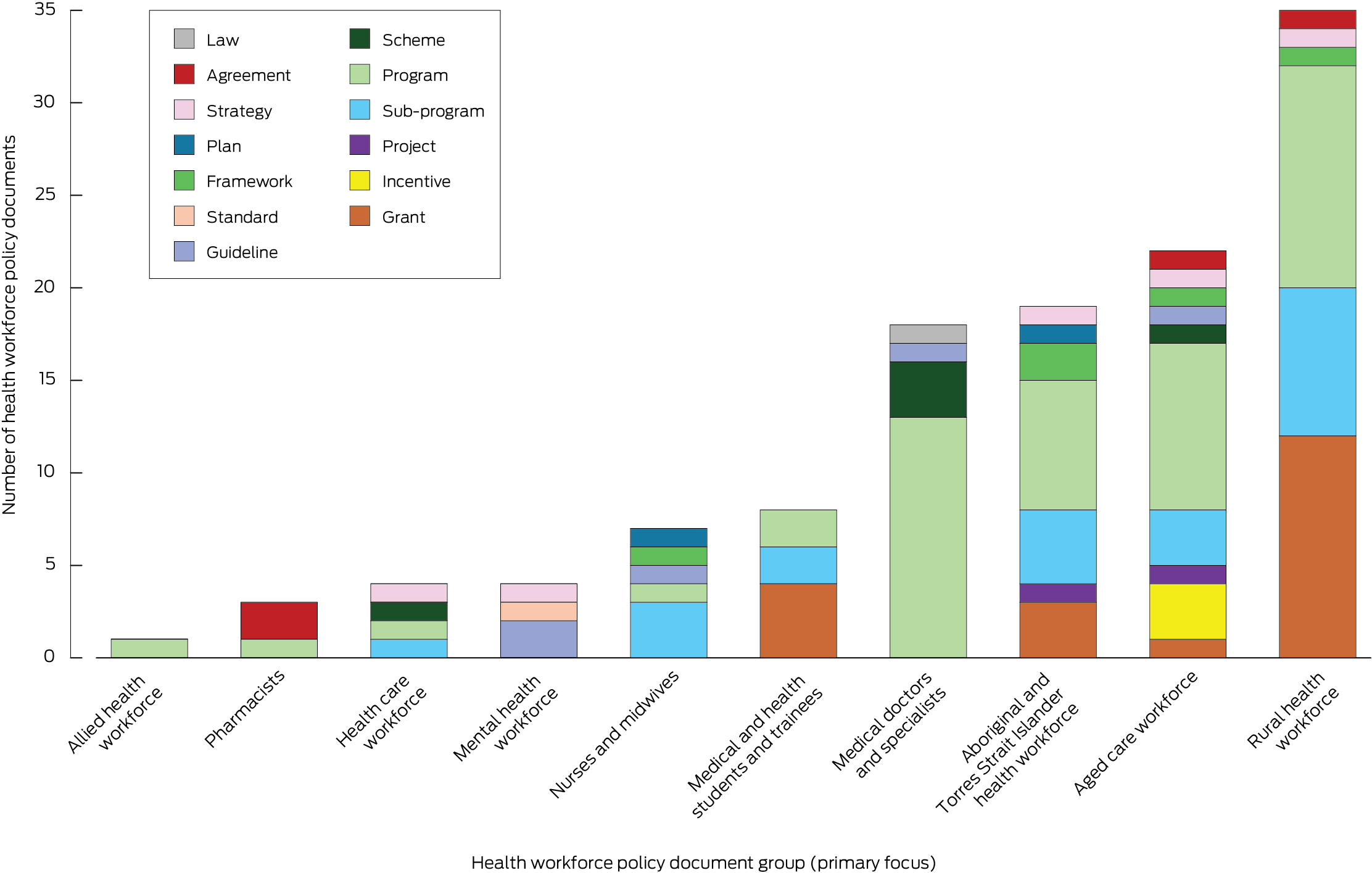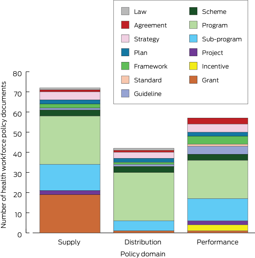 Results: We included 121 policy documents in our analysis. By policy group, the number of documents was greatest for the rural health workforce (35), aged care (22), and Aboriginal and Torres Strait Islander health workforce (19); the numbers were lowest for pharmacy (three) and allied health (one), and none had public health or emergency care as their focus. Mixed policy instruments (multiple interest group programs, sub‐programs, incentives, grants) were more numerous (98 documents) than government‐led instruments (23 documents). Health workforce supply was a focus of 72 documents, performance of 57 documents, and distribution of 42 documents. Document nomenclature was inconsistent; 44 documents had policy labels that did not correspond to their content or purpose.